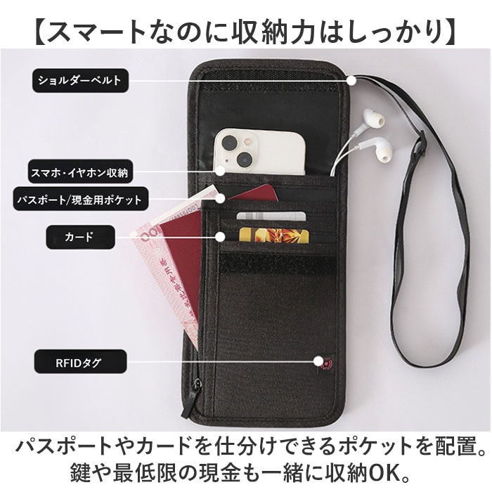 | 商品説明 | 【貴重品をまとめて防犯面も安心】旅のお供に嬉しい、スキミング防止機能付き!貴重品を携帯できる「パスポートケース」。【スキミング防止機能を搭載】電磁波を遮断する、スキミング防止仕様!カード情報や個人情報を保護。(※1)STOP RFIDタグの有無は、カラーにより異なります。【開け閉めしやすくストレスフリー】開口フラップは面ファスナー式。移動中や急いでいる時も手間取らない!【スマートなのに収納力はしっかり】パスポートやカードを仕分けできるポケットを配置。鍵や最低限の現金も一緒に収納OK。【お好みに合わせてスタイルチェンジ】手持ちしたりバッグに装着。ストラップを取り付けて斜め掛けや首掛けし、服の中に隠すも良し。(※2)ストラップは長さ調節可能です。【不意の雨に対応できる撥水性】汚れや水滴を弾きやすい、撥水加工済み。お手入れも拭き取るだけ。(※3)完全防水ではありません。濡れたらすぐに拭き取ってください。【持つ人を選ばないシンプル設計】年代や性別問わず持ちやすいデザイン&カラー。家族お揃いで揃えるのもおすすめ。【ポケット仕様】内側:オープンポケット×3、縦ファスナー付きポケット×1(上部オープン仕様)フラップ:ファスナーポケット×1背面:オープンポケット×1 |