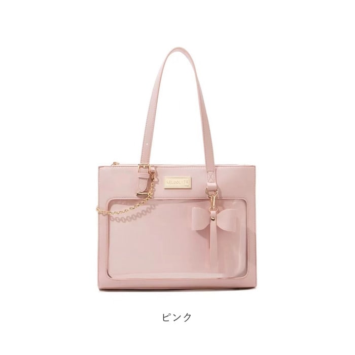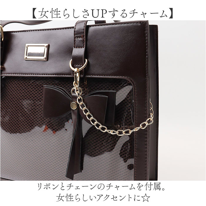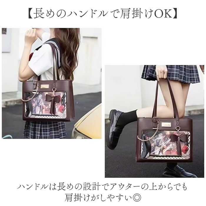 | 商品説明 | 【推し活でもデイリーでも活躍】推し活から普段使いまでできちゃう♪オシャレさと両立したトート痛バッグが発売。【自分だけのデコレーションに☆】クリア窓に、バッジやアクスタなど大好きな推し活グッズをデコレーションできる仕様!【バッグを傷めないバッジシート】バッジの取り付けに便利なメッシュ素材の専用シート付き。バッグを傷めないのもポイント。【普段使いもできるデザイン】大人っぽいおしゃれなデザインが魅力。くるっとデコ窓を後にすれば普段使いもできる優れモノ【大容量だから毎日使える!】見た目以上の収納力で、通勤通学、旅行やお出かけと幅広いシーンで活躍する!【女性らしさUPするチャーム】リボンとチェーンのチャームを付属。女性らしいアクセントに☆【自立するから使いやすい】しっかりした作りで、バッグ本体が自立ので、荷物の出し入れがしやすいのがポイント。【長めのハンドルで肩掛けOK】ハンドルは長めの設計でアウターの上からでも肩掛けがしやすい◎【2WAYでハンズフリーにも◎】斜め掛けができるショルダー付き。イベントやライブで、ハンズフリーで動ける◎【ポケット仕様】メインルーム・・・ファスナーポケット×1 |