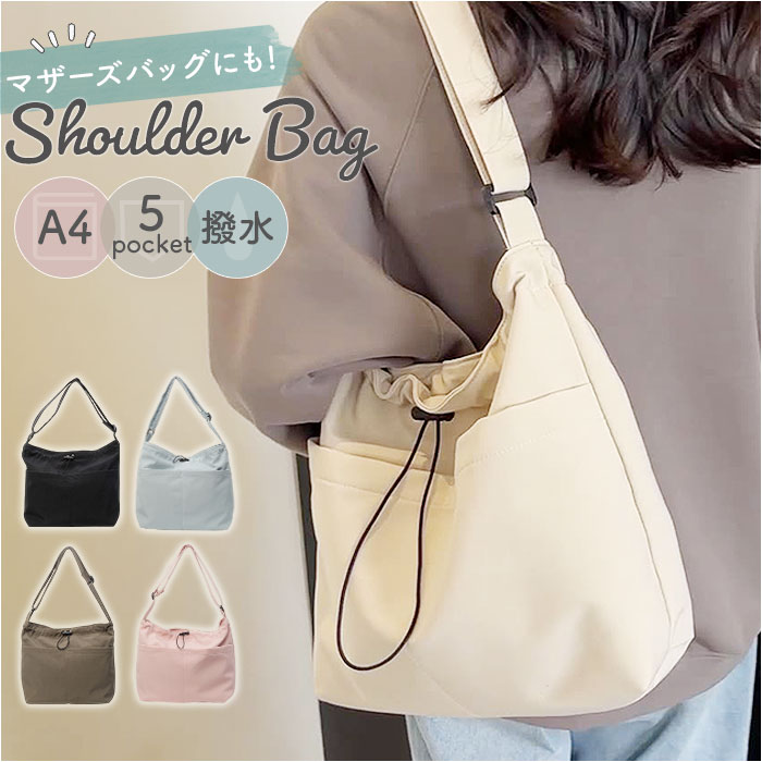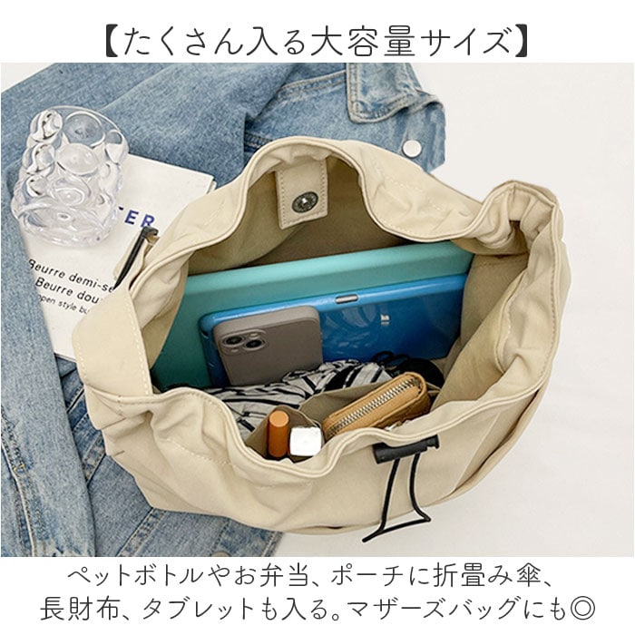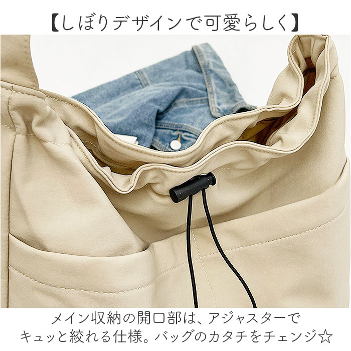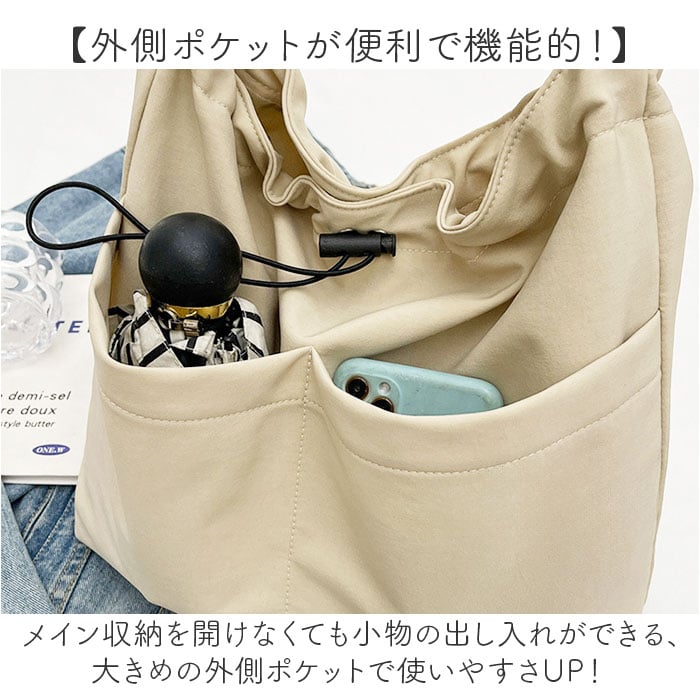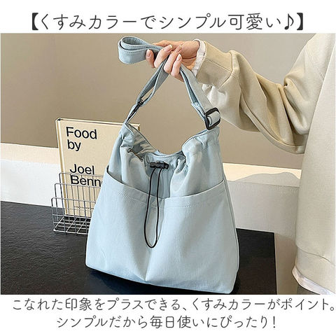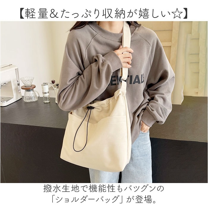 | 商品説明 | 【軽量&たっぷり収納が嬉しい☆】撥水生地で機能性もバツグンの「ショルダーバッグ」が登場。【くすみカラーでシンプル可愛い♪】こなれた印象をプラスできる、くすみカラーがポイント。シンプルだから毎日使いにぴったり!【たくさん入る大容量サイズ】ペットボトルやお弁当、ポーチに折畳み傘、長財布、タブレットも入る。マザーズバッグにも◎【突然の雨にも強い撥水生地】水を弾く、撥水生地を採用。汚れにも強いのが嬉しいポイント! ※完全防水ではありません。【しぼりデザインで可愛らしく】メイン収納の開口部は、アジャスターでキュッと絞れる仕様。バッグのカタチをチェンジ☆【外側ポケットが便利で機能的!】メイン収納を開けなくても小物の出し入れができる、大きめの外側ポケットで使いやすさUP!【女性に優しい軽量設計♪】たくさん荷物を入れても快適に持ち運びができる、軽量設計。旅行などの遠出にもオススメ。【ポケット仕様】フロント:オープンポケット×2メイン収納:オープンポケット×2背面:ファスナーポケット×1 |