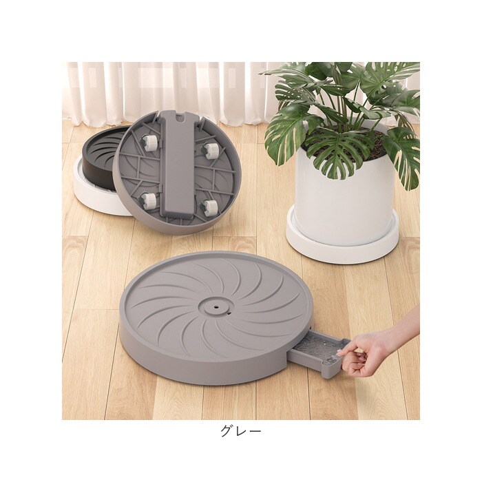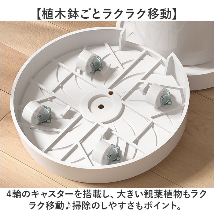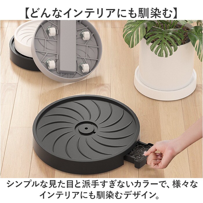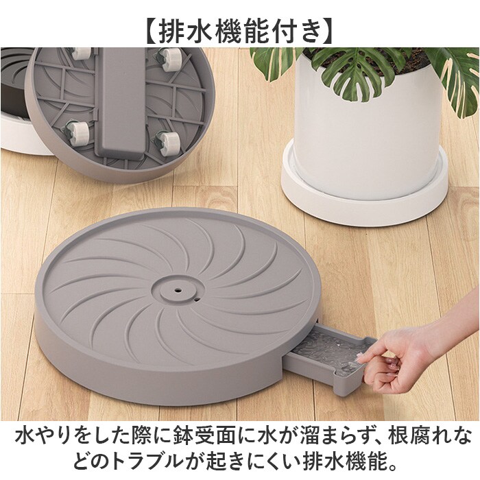 | 商品説明 | 【移動もお掃除も簡単に】・1号から3号までの植木鉢に対応。キャスター付きの植木鉢台が新発売。【植木鉢ごとラクラク移動】・4輪のキャスターを搭載し、大きい観葉植物もラクラク移動♪掃除のしやすさもポイント。【排水機能付き】水やりをした際に鉢受面に水が溜まらず、根腐れなどのトラブルが起きにくい排水機能。【水捨てが楽ちんなトレイ】水がトレイに溜まる構造でトレイを引き出せば、簡単に排水が捨てられるのもGOOD。【どんなインテリアにも馴染む】シンプルな見た目と派手すぎないカラーで、様々なインテリアにも馴染むデザイン。【植木鉢のサイズで選べる】直径22cm~30cmまでのサイズ展開。植木鉢のサイズに合わせて選んで♪ |