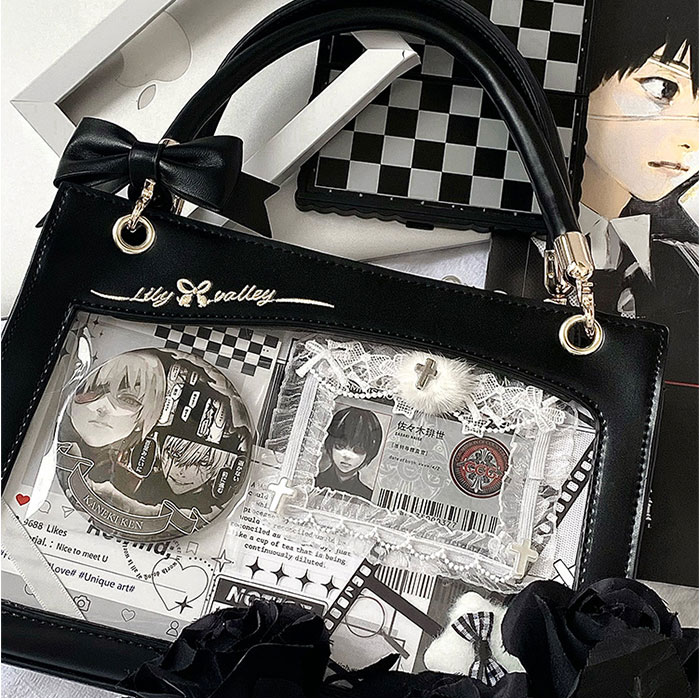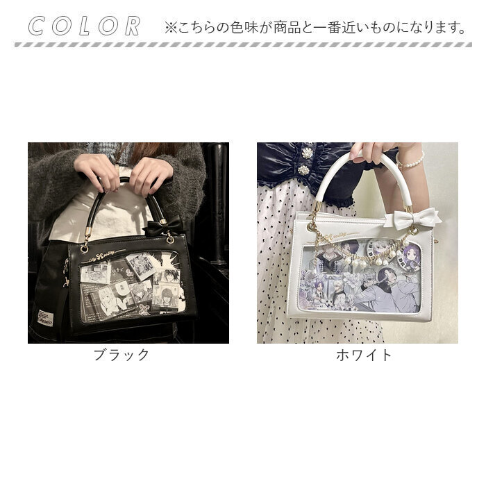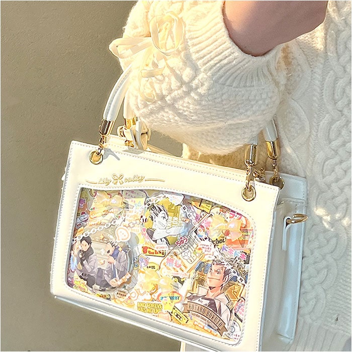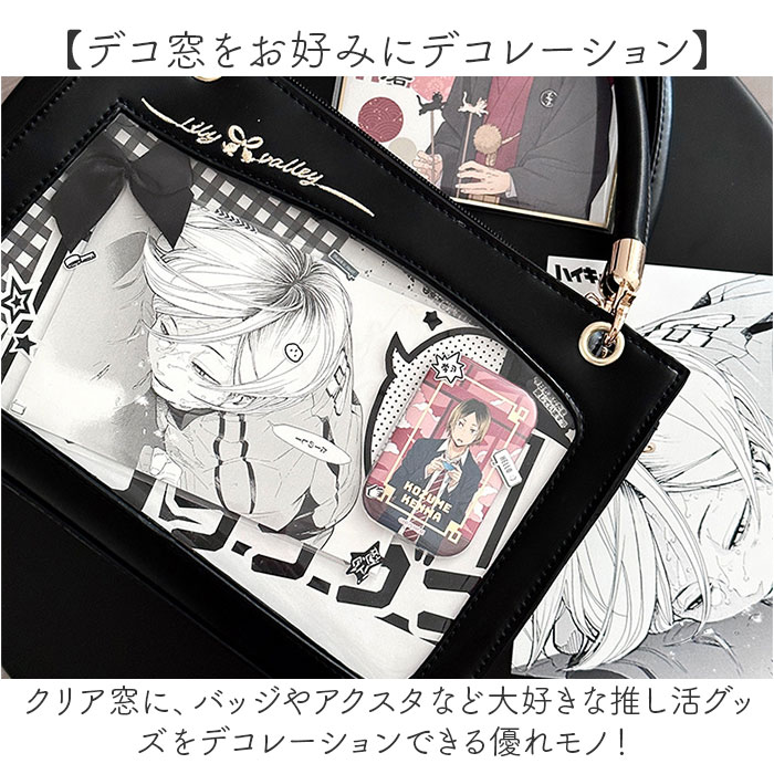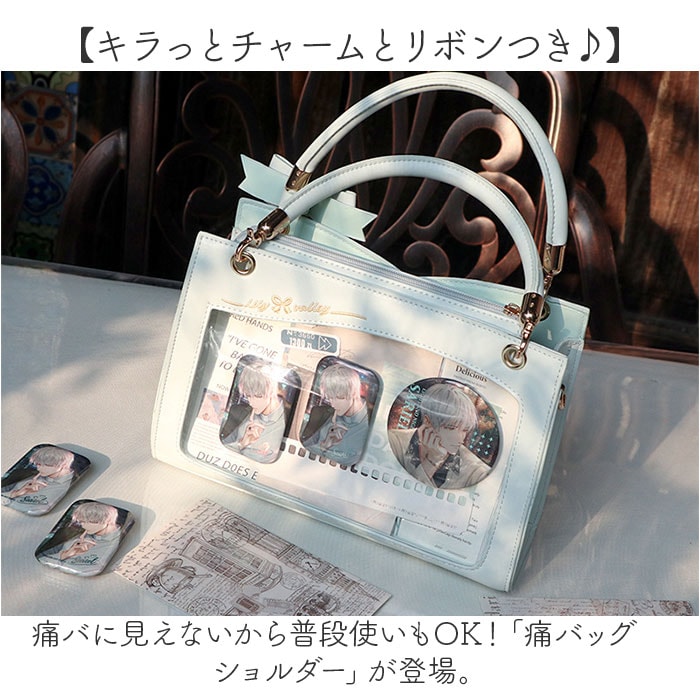 | 商品説明 | 【キラっとチャームとリボンつき♪】痛バに見えないから普段使いもOK!「痛バッグ ショルダー」が登場。【デコ窓をお好みにデコレーション】クリア窓に、バッジやアクスタなど大好きな推し活グッズをデコレーションできる優れモノ!【レイヤーできるプレート付き】デコレーションしやすいバッジレイヤー仕様のプレートつき。初心者さんもデコしやすい◎【普段使いもできる2デザイン☆】くるっと裏にするだけで、2デザインを楽しめる。デコ面の裏側にはおしゃれな刺繍デザインを♪【ちょうどよい収納力がGOOD】コンパクトに見えて、しっかり収納できるサイズ感。ペットボトル、ペンライトも入っちゃう。【ライブやイベントもお任せ!】手持ちとショルダーの2WAYだから、ハンズフリーにもなれちゃう!お好みの持ち方で◎【チャームやリボンで可愛さUP】付属のアイテムで、お好みアレンジ!イミテーションパールがキラッとおしゃれ。【ポケット仕様】ポケットなし |