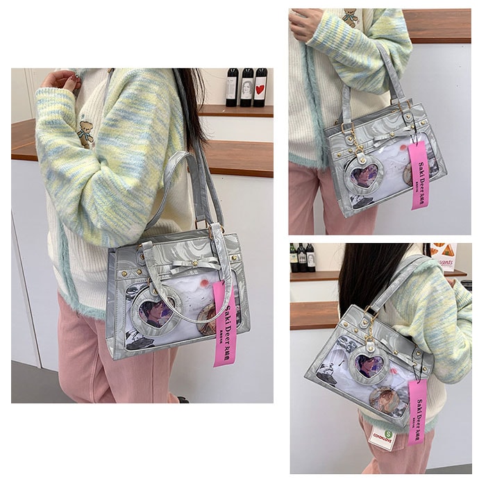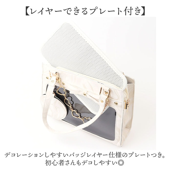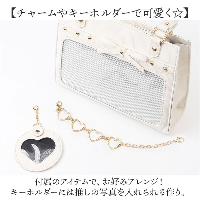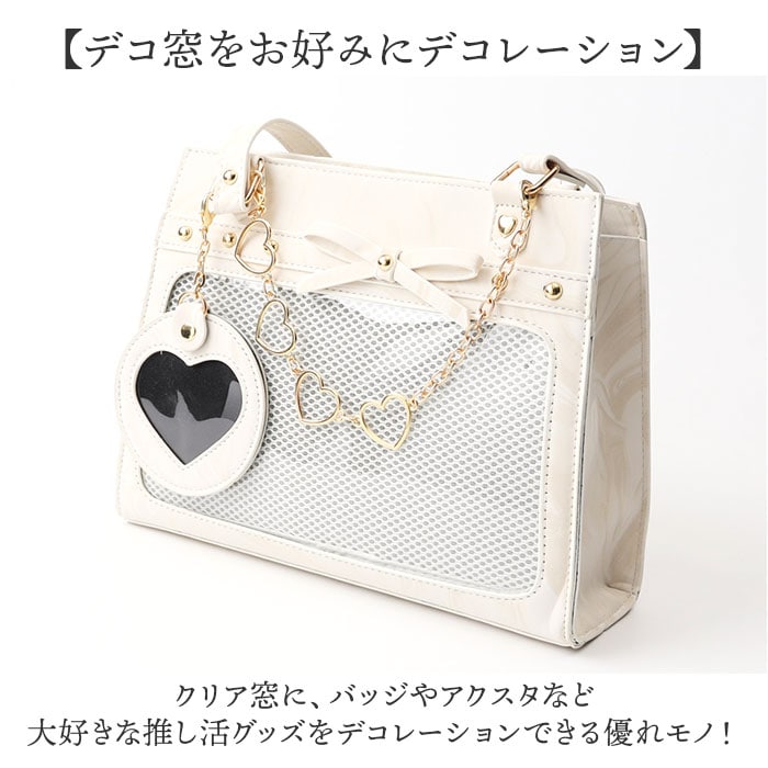 | 商品説明 | 【チャームとフォトキーホルダー付♪】痛バに見えないから普段使いもOK!「痛バッグ ショルダー」が登場。【デコ窓をお好みにデコレーション】クリア窓に、バッジやアクスタなど大好きな推し活グッズをデコレーションできる優れモノ!【レイヤーできるプレート付き】デコレーションしやすいバッジレイヤー仕様のプレートつき。初心者さんもデコしやすい◎【普段使いもできる2デザイン☆】くるっと裏にするだけで、2デザインを楽しめる。デコ面の裏側にはキュートなBIGハートをON♪【ちょうどよい収納力がGOOD】コンパクトに見えて、しっかり収納できるサイズ感。ペットボトル、ペンライトも入っちゃう。【ライブやイベントもお任せ!】手持ちとショルダーの2WAYだから、ハンズフリーにもなれちゃう!お好みの持ち方で◎【チャームやキーホルダーで可愛く☆】付属のアイテムで、お好みアレンジ!キーホルダーには推しの写真を入れられる作り。【ポケット仕様】ポケットなし |