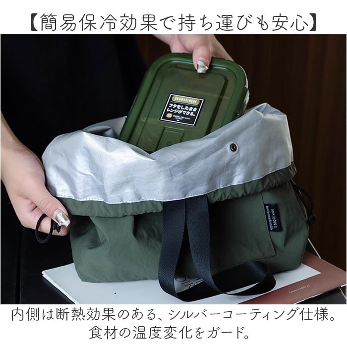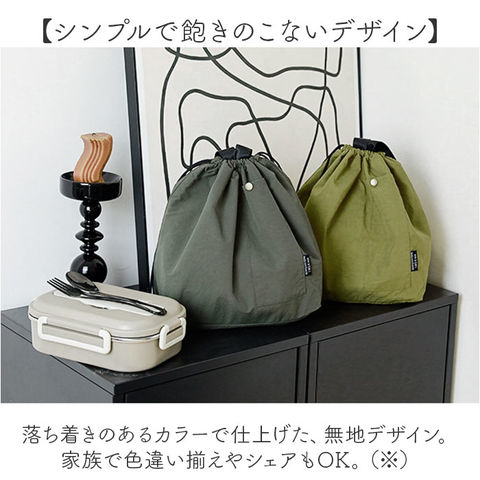 | 商品説明 | 【お弁当グッズをすっきり持ち運び】ランチのお供にぴったり。まとめて収納できて、デイリーに活躍する「ランチバッグ」。【キュッと絞って飛び出しをガード】ヒモで口を絞れる巾着タイプ。開閉はスムーズで、中身のこぼれ落ちもガード。【簡易保冷効果で持ち運びも安心】内側は断熱効果のある、シルバーコーティング仕様。食材の温度変化をガード。【お弁当とペットボトルなどを一緒に】程よくマチを設け、お弁当を安定した状態で持ち運べる!ペットボトルやカトラリーもる大きさ。【お買い物やレジャーシーンでも重宝】生鮮食品を入れたり、レジャーシーンで購入した飲み物などを入れるバッグとしても重宝。【拭き取るだけでお手入れも簡単】内側は水滴や汚れをサッと弾く、撥水性も。ひと拭きでお手入れも手間いらず。(※)完全防水ではありません。【シンプルで飽きのこないデザイン】落ち着きのあるカラーで仕上げた、無地デザイン。家族で色違い揃えやシェアもOK。(※)フロントにポケットを配置しておりますが、開口部が狭いため機能性は低いものとなります。デザインの1つとして捉えてください。【ポケット仕様】前面:スナップボタン式ポケット×1 |