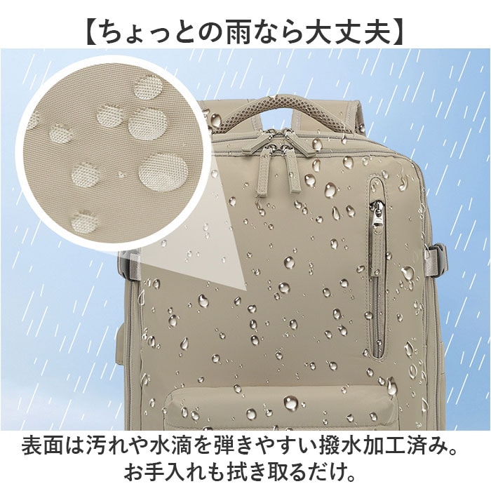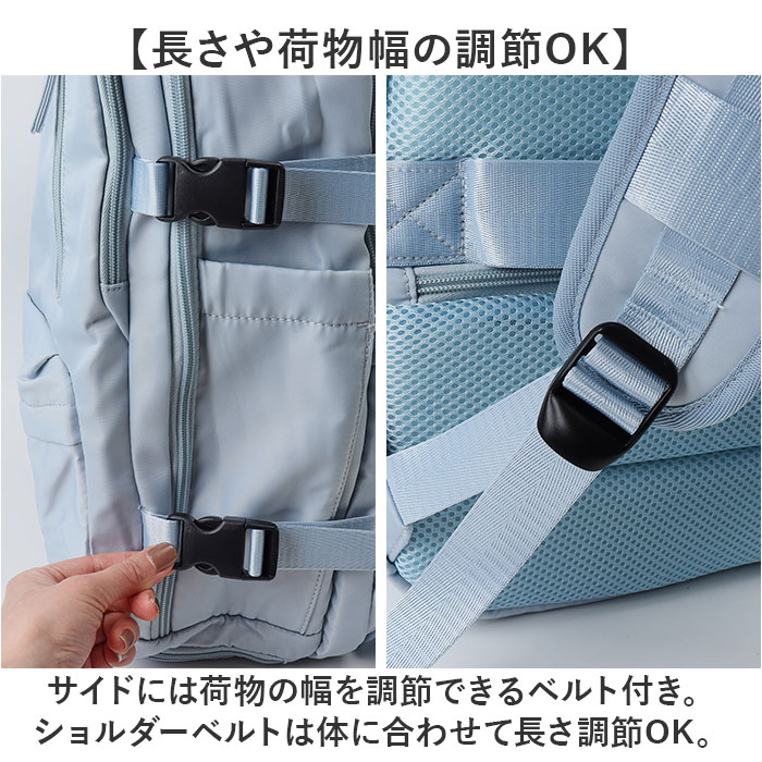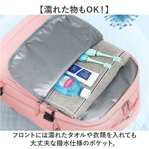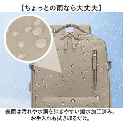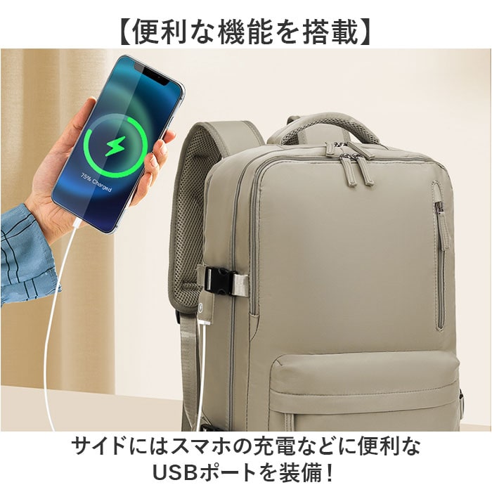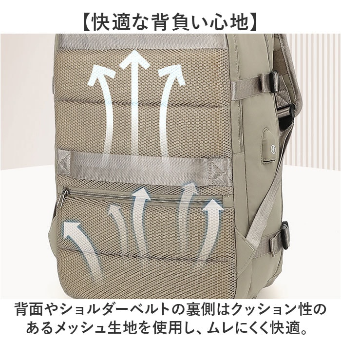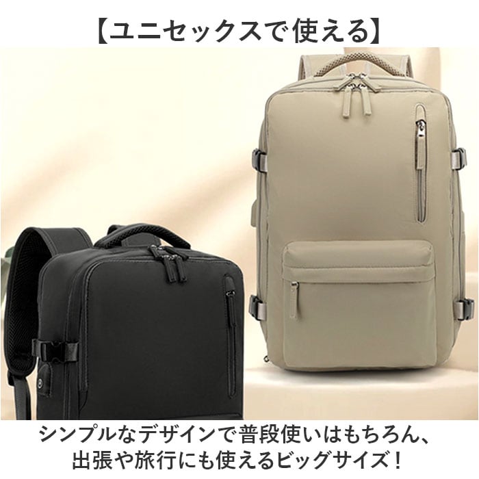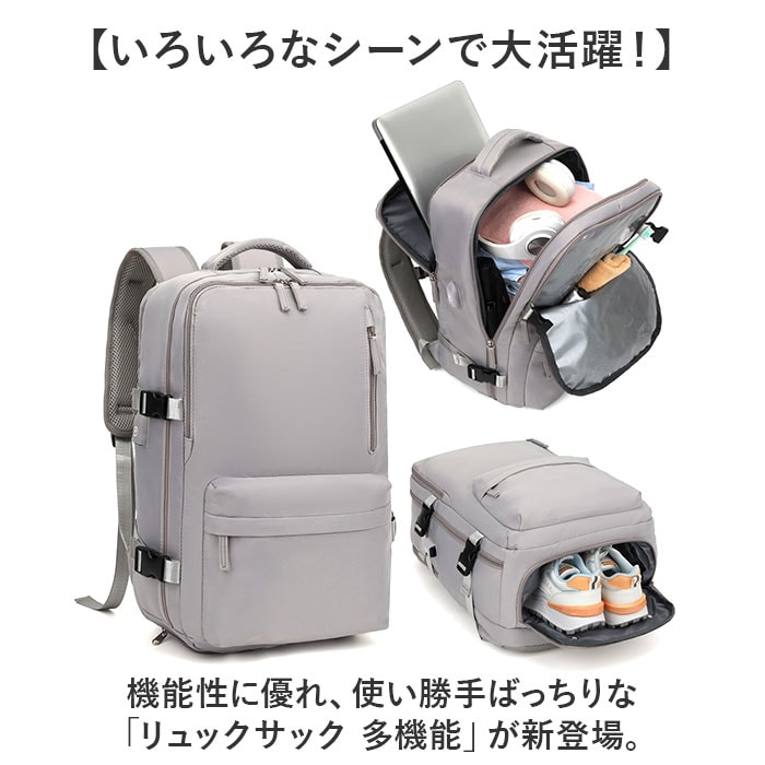 | 商品説明 | 【いろいろなシーンで大活躍!】機能性に優れ、使い勝手ばっちりな「リュックサック 多機能」が新登場。【大きく開くダブルファスナー仕様】メインの開口部は180度ガバッと大きく開く!中身が確認しやすく、出し入れラクラク。【大容量で収納力抜群!】・B4サイズが余裕で入る!お出かけに必要な荷物をザクザクと入れられる◎【シューズポケット付き】底面にシューズポケット付き。メイン収納と別れているので汚れを気にせず収納可能。【便利な機能を搭載】サイドにはスマホの充電などに便利なUSBポートを装備!【PCポケットも完備】メインルームの背面側には、大切な機器を優しく保護するクッション付きのPCポケット。【濡れた物もOK!】フロントには濡れたタオルや衣類を入れても大丈夫な撥水仕様のポケット。【便利なポケットを多数配置】内側や外側にポケットを多数配置しているので、サッと取り出したい小物の収納に便利。【持ち方選べる3WAYタイプ】リュック、手持ち、キャリーバッグに取付できるキャリーオン機能。お好みの持ち方ができる!【体にしっかりフィット】リュックで使う時、チェストベルトで固定すればズレ落ちを防止!【長さや荷物幅の調節OK】サイドには荷物の幅を調節できるベルト付き。ショルダーベルトは体に合わせて長さ調節OK。【快適な背負い心地】背面やショルダーベルトの裏側はクッション性のあるメッシュ生地を使用し、ムレにくく快適。【ちょっとの雨なら大丈夫】表面は汚れや水滴を弾きやすい撥水加工済み。お手入れも拭き取るだけ。【ユニセックスで使える】シンプルなデザインで普段使いはもちろん、出張や旅行にも使えるビッグサイズ! |