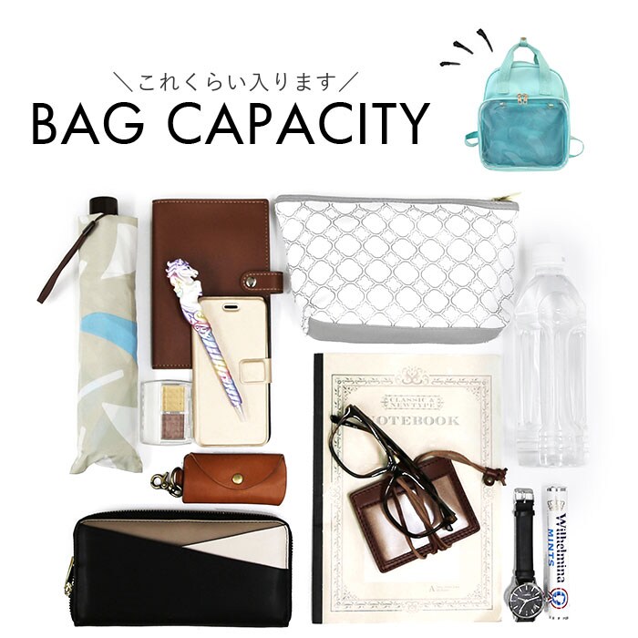 | サイズ | 【リュック本体】 [縦]約31cm/[横(底部)]約26cm/[マチ]約10cm [持ち手]約24cm [ショルダー]約55cm~約105cm(調節可能) 【クリア部分】 [縦]約21cm/[横]約26cm/[マチ]約3cm ※サイズは当店計測の実寸サイズです。実際の商品ならびにメーカー表記サイズとは多少の誤差が生じる場合がございます。あらかじめご了承ください。 |