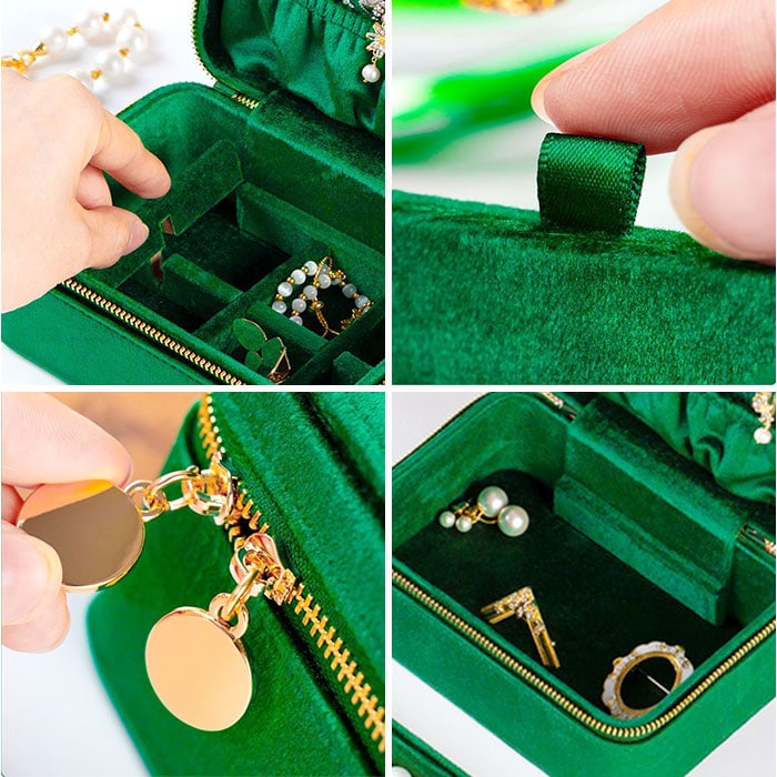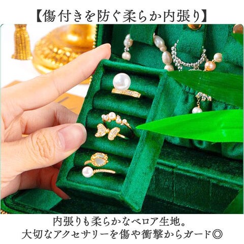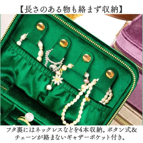 | 商品説明 | 【アクセサリーをすっきり整理整頓】ごちゃつかずに収納&大切に保管◎「ベロアアクセサリーケース」。【高級感のある大人な仕上がり】起毛感のあるしっとり滑らかなベロア生地。上品な光沢が、華やかなアクセサリーにマッチ♪【ぐるっと大きく180度オープン】ダブルファスナーがラウンド型に開閉。中身を確認しやすく、出し入れもラクラク。【お気に入りアイテムを1つに収納】トレー付きの2段式。仕切りをアレンジでき、指輪やバングル、ブローチ、イヤリングをIN。(※)トレーのリングスロット、下段メインルームの仕切りは取り外し可能です。【長さのある物も絡まず収納】フタ裏にはネックレスなどを4本収納。ボタン式&チェーンが絡まないギャザーポケット付き。【傷付きを防ぐ柔らか内張り】内張りも柔らかなベロア生地。大切なアクセサリーを傷や衝撃からガード◎【置き場所に困らないコンパクトさ】手に取りやすく場所を取らないサイズ感。長期の旅行や帰省など、持ち運びもOK。【大切な方へのギフトにもおすすめ】飽きが来ず長く愛用できるデザインが魅力。贈り物としてもおすすめ♪【収納スペース】トレー(上段):リングスロット×5(仕取り外し可能)、フリースペース×1メインルーム(下段):フリースペース×8(仕切りは取り外し可能)フタ裏:スナップボタン式ネックレス掛け×4(下に1つギャザーポケット付き) |