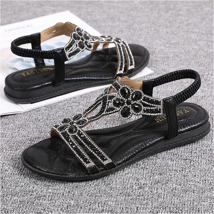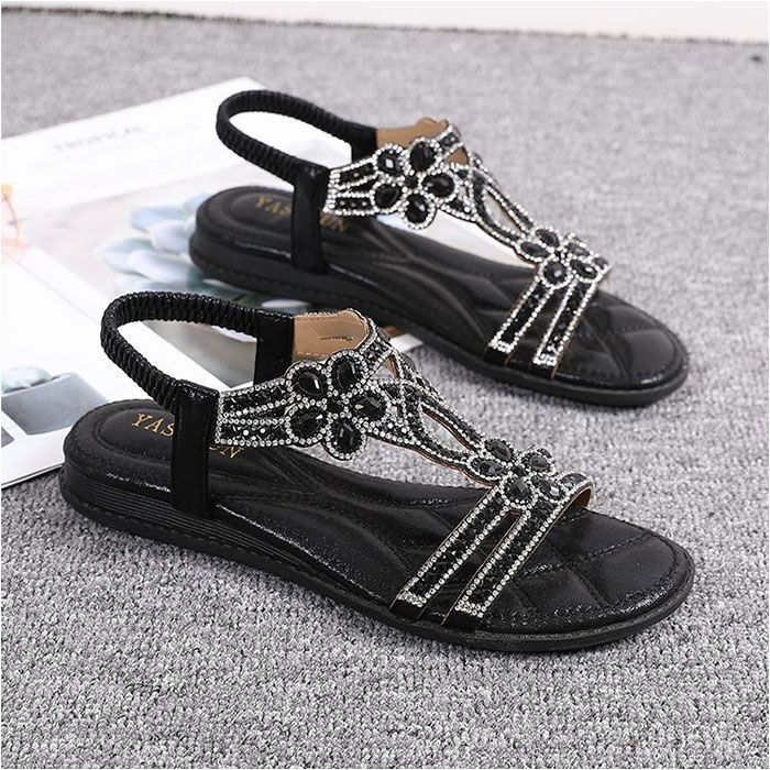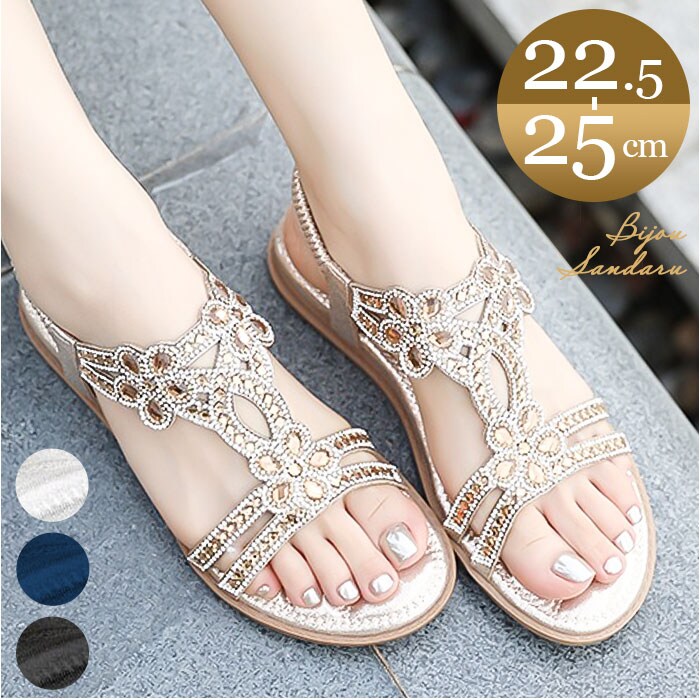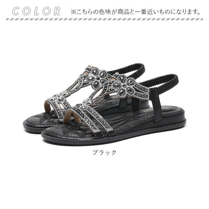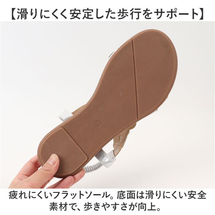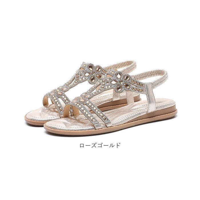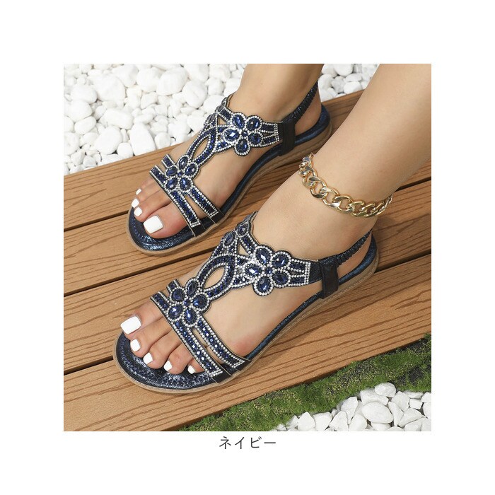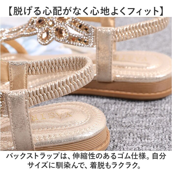 | 商品説明 | 【夏のお出かけの相棒に☆】サッと履けて、おしゃれにキマる☆夏にヘビロテ間違いなしの「レディース用サンダル」。【キラッと輝いて目を惹く1足】アッパーのベルトに、ビジューをON♪足元を上品に彩り、コーデのアクセントに。【汗ばむ季節にぴったりな仕様】つま先が開いたオープントゥデザイン。全体的に開放感があり、真夏でもムレにくい!【脱げる心配がなく心地よくフィット】バックストラップは、伸縮性のあるゴム仕様。自分サイズに馴染んで、着脱もラクラク。【柔らかく軽やかな履き心地】インソール部分には弾力性をプラス。足裏にかかる衝撃を吸収し、素足でも快適。【滑りにくく安定した歩行をサポート】疲れにくいフラットソール。底面は滑りにくい安全素材で、歩きやすさが向上。【色んなシーンで使えて万能】普段のお出かけにはもちろん。リゾートやレジャーシーンでも重宝。(※)防水仕様ではありません。【お気に入りを選べるカラーとサイズ】肌に馴染みやすく、色んなコーデにマッチするカラー。サイズ展開が豊富なのも嬉しいポイント! |