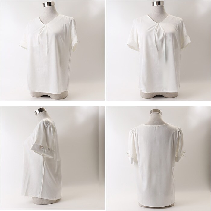 | 商品説明 | 【特別なお出かけやオフィスに】様々なシーンで活躍☆オン・オフどちらでも使えるきれいめブラウスが新発売。【光沢感で大人上品】程よい光沢感で大人上品な仕上がり☆派手過ぎずちょっとした華やかさも♪【デコルテやアクセを綺麗魅せ】首元がすっきり見えるVネック仕様で、デコルテラインやアクセサリーが映える♪【程よいアクセントをプラス】フロントに大きなタックを取り入れ、シンプルさの中にアクセントもプラス。【女性らしさを上げるボタン付き】袖にはパール風ビジュー付きのボタンを配置。ゴールドカラーでより女性らしい仕上がり。【シーン問わず使えるシンプルさ】シンプルな作りで普段着としてはもちろん、オフィスカジュアルにも使える優秀アイテム☆ |