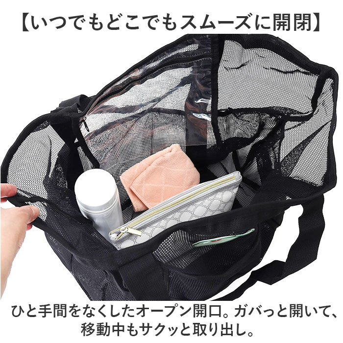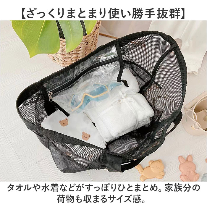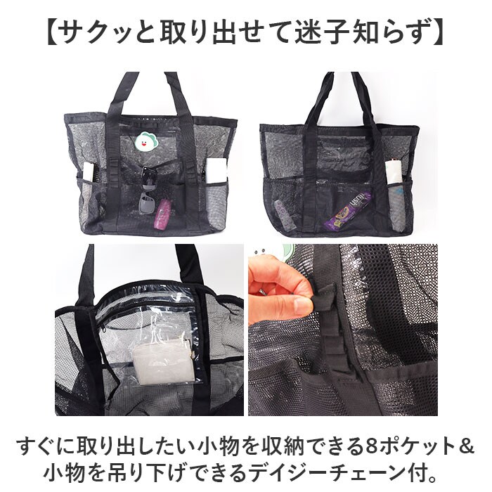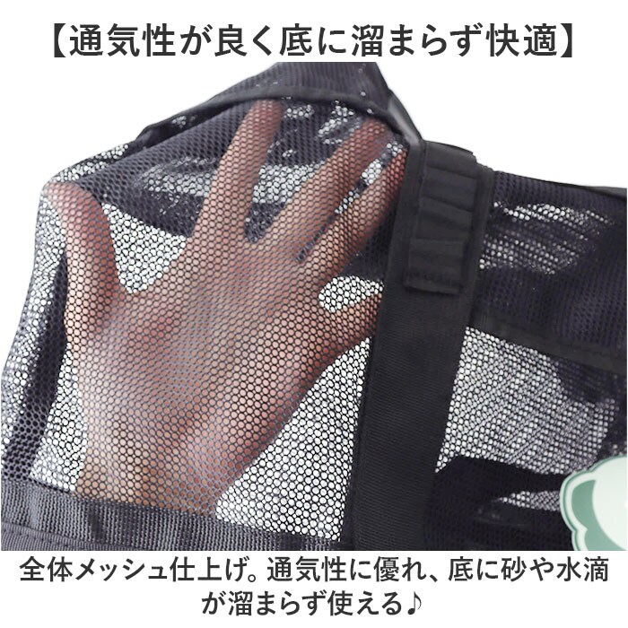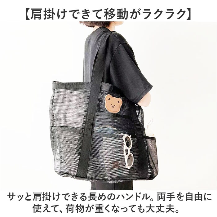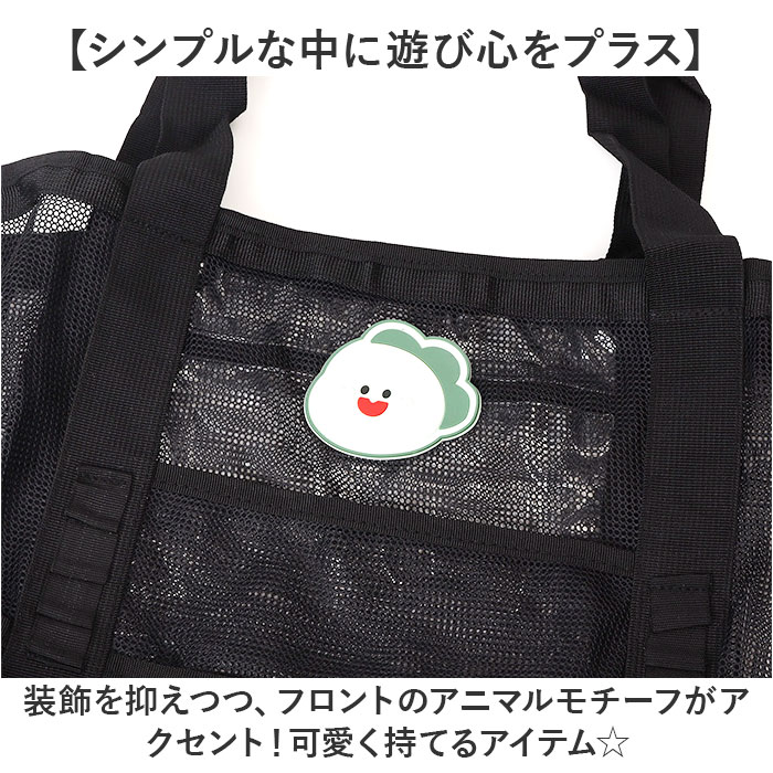 | 商品説明 | 【ビーチやプールなどで大活躍!】ちょこっと濡れても、サッと拭き取れて乾きも速い◎気軽に持ち出せる「ビーチバッグ」。【通気性が良く底に溜まらず快適】全体メッシュ仕上げ。通気性に優れ、底に砂や水滴が溜まらず使える♪【肩掛けできて移動がラクラク】サッと肩掛けできる長めのハンドル。両手を自由に使えて、荷物が重くなっても大丈夫。【いつでもどこでもスムーズに開閉】ひと手間をなくしたオープン開口。ガバっと開いて、移動中もサクッと取り出し。【ざっくりまとまり使い勝手抜群】タオルや水着などがすっぽりひとまとめ。家族分の荷物も収まるサイズ感。【サクッと取り出せて迷子知らず】すぐに取り出したい小物を収納できる8ポケット&小物を吊り下げできるデイジーチェーン付。【シンプルな中に遊び心をプラス】装飾を抑えつつ、フロントのアニマルモチーフがアクセント!可愛く持てるアイテム☆【ポケット仕様】内側:ファスナー式クリアポケット×1外側:オープンポケット×7 |