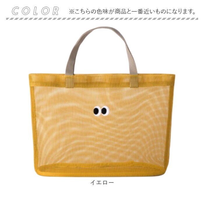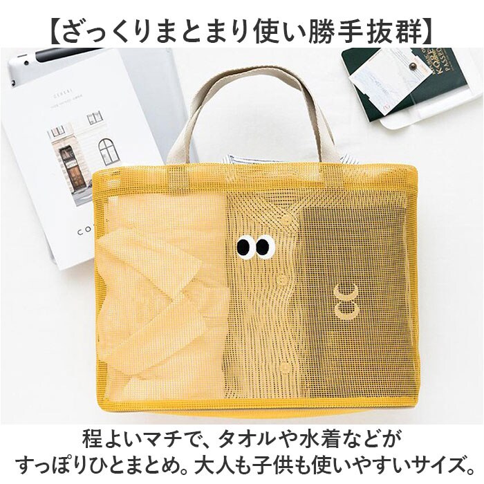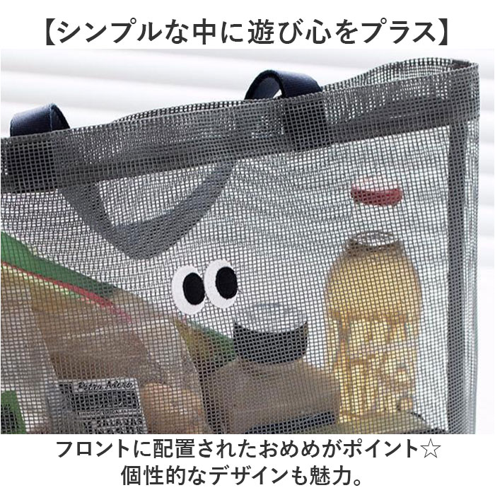 | 商品説明 | 【ビーチやプールなどで大活躍!】ちょこっと濡れても、サッと拭き取れて乾きも速い◎気軽に持ち出せる「プールバッグ」。【通気性が良く底に溜まらず快適】通気性に優れ、底に砂や水滴が溜まらず使える全体メッシュ仕上げ。手洗いもOK♪【手持ちも肩掛けもお好みで】手で持ったり腕に掛けたり。肩掛けもできる長さのハンドル。軽量で疲れも軽減◎【いつでもどこでも開け閉め簡単】開口部は2箇所のスナップボタン式。いつでも簡単に開け閉めでき、飛び出しをガード。【ざっくりまとまり使い勝手抜群】程よいマチで、タオルや水着などがすっぽりひとまとめ。大人も子供も使いやすいサイズ。【シンプルな中に遊び心をプラス】フロントに配置されたおめめがポイント☆個性的なデザインも魅力。 |