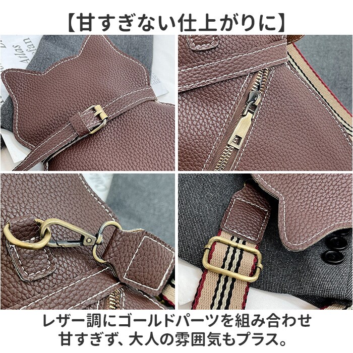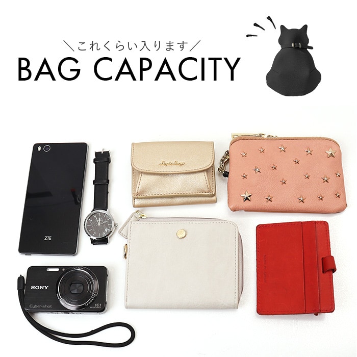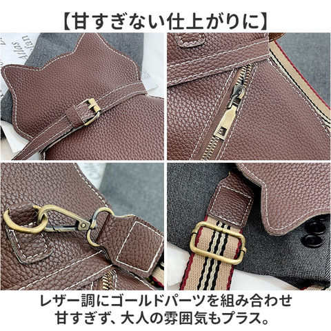 | 商品説明 | 【ネコ型デザインがポイント】ネコちゃんデザインがとってもキュート☆おしゃれなレザー調のショルダーバッグ。【マストアイテムをIN】スマホやハンカチ、お財布などのマストアイテムが入るサイズ。ミニマリストの方にお出かけに【ワンマイルのお出かけにも】お散歩やちょっとそこまでのお出かけにも持ち出せるサイズなのもGOOD。【ネコちゃんシルエット】ユニークで可愛いネコちゃんシルエットがポイント!猫好きさんや可愛い物が好きな方に♪【甘すぎない仕上がりに】レザー調にゴールドパーツを組み合わせ甘すぎず、大人の雰囲気もプラス。【ストライプ柄のショルダーをON】長さ調節ができ、自分サイズにフィット!ハンズフリーで動きやすさもアリ◎【お手入れ不要な合皮】本革のようなシボ感のある合皮素材で万が一濡れてもお手入れ不要!【毎日使える軽さ】毎日気軽に使える軽量さも嬉しいポイント。 |