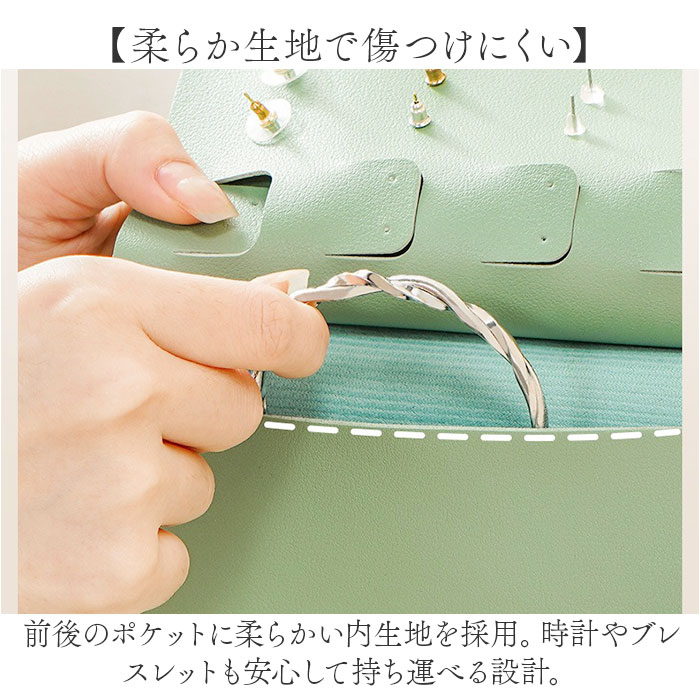 商品説明【お気に入りをすっきり整理♪】アクセサリーの整理がひと目で完結。気軽に持ち歩ける「ピアス アクセサリー収納ケース」【ピアス42セット収納OK】ピアスやイヤリングをすっきり収納。たっぷり入ってもかさばらないコンパクトサイズ。【厚みが出にくい設計】ページごとに工夫されたポケット位置。かさばりにくく、見た目もスマート。【見開き仕様でひと目で把握】本のように開ける構造で、アクセサリーが一目瞭然。探す手間がなくて便利♪【柔らか生地で傷つけにくい】前後のポケットに柔らかい内生地を採用。時計やブレスレットも安心して持ち運べる設計。【ベルト付きで調節も簡単】スナップボタン付きのベルトで、しっかりホールド。荷物の多い日も安心。【少し濡れてもあわてない!】表面は撥水加工の生地。汚れや水滴もサッと拭けて扱いやすさ◎(※)完全防水ではありません。【くすみカラーで大人可愛い】旅行や出張の荷物にもなじむ落ち着いた色味。上品さと可愛さを両立したカラー展開。