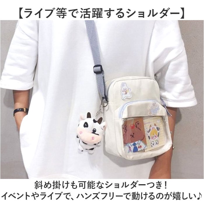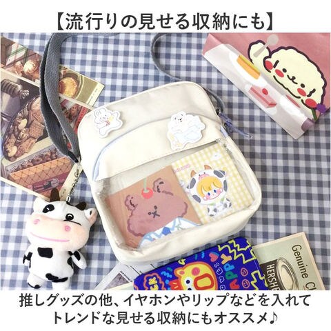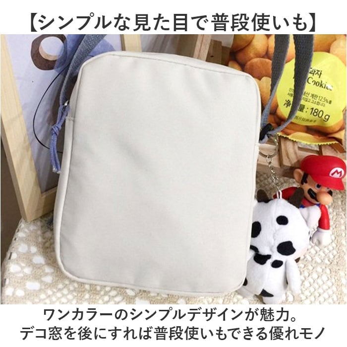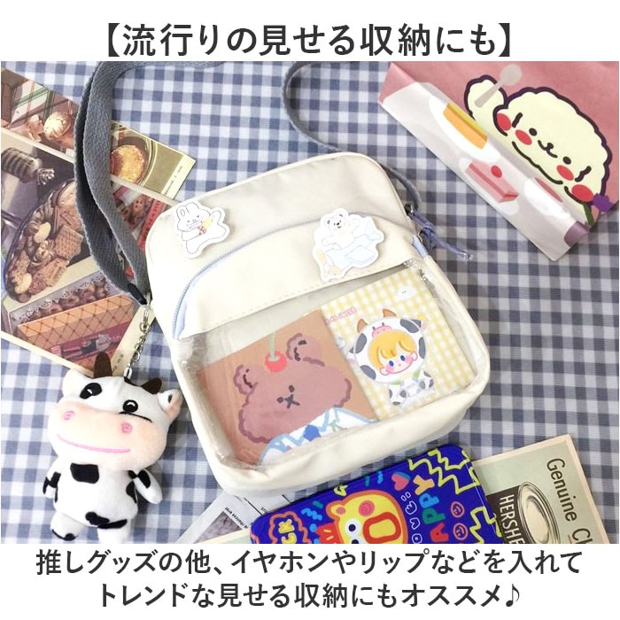 | 商品説明 | 【普段使いもできる推し活グッズ】普段使いも推し活もお任せ☆ミニマルに持てるショルダータイプの痛バッグが新発売。【自分だけのデコレーションに☆】クリア窓に、バッジやアクスタなど大好きな推し活グッズでデコレーションできる仕様!【シンプルな見た目で普段使いも】ワンカラーのシンプルデザインが魅力。デコ窓を後にすれば普段使いもできる優れモノ【マストなアイテムをIN】スマホやハンカチ、2つ折りのお財布などマストなアイテムが収納可能。【ライブ等で活躍するショルダー】斜め掛けも可能なショルダーつき!イベントやライブで、ハンズフリーで動けるのが嬉しい♪【流行りの見せる収納にも】推しグッズの他、イヤホンやリップなどを入れてトレンドな見せる収納にもオススメ♪【ポケット仕様】フロント・・・ファスナーポケット×1(クリア窓仕様) |