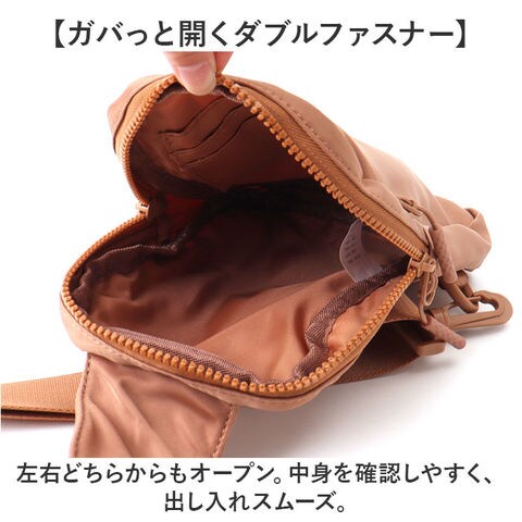 | 商品説明 | 【ミニマルスタイルにおすすめ】貴重品を身軽に携帯◎色んなシーンで活躍する、ミニサイズの「ボディバッグ」。【両手が空いてアクティブに動ける】ショルダーの長さを調節して斜め掛け。体にフィットし、両手も自由に使えて移動がラクラク。(※1)ショルダーは左右付け替えが可能です。【ガバっと開くダブルファスナー】左右どちらからもオープン。中身を確認しやすく、出し入れスムーズ。【マストアイテムをひとまとめ】コンパクト&スリムフォルム。折り財布やスマホ、エチケットアイテムなどをIN。【サクッと取り出せて迷子知らず】内側には3つのカードポケット、外側には2つのファスナーポケットを。小物が定位置に。【ちょっとの雨なら大丈夫】水滴や汚れをサッと弾く撥水加工済み。お手入れも拭き取るだけ。(※2)完全防水ではありません。【持ち歩きやすいシンプルなデザイン】コーデに合わせやすい、装飾のないワンカラー仕上げ。ラフに持ち出せるボディバッグ。【ポケット仕様】内側:カードポケット×3前面:ファスナーポケット×1背面:縦ファスナーポケット×1 |