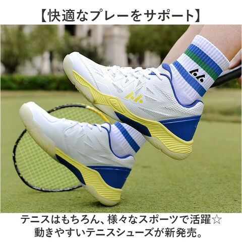 | 商品説明 | 【快適なプレーをサポート】テニスはもちろん、様々なスポーツで活躍☆動きやすいテニスシューズが新発売。【スポーツシーンで】テニスやバドミントン、卓球などいろいろなコートで活躍するスポーツシューズ。【蒸れにくいメッシュ生地】通気性にも配慮したメッシュ生地でたくさん動いても履いても快適な靴内をキープ!【室内のコートでも滑りにくい】しっかりグリップするアウトソールで室内のコートでも滑りにくく安心◎【疲れにくい設計】軽量設計と柔らかな履き心地で足に優しく疲れにくい作り。【衝撃を吸収するインソール】クッション性のあるインソールが衝撃を吸収し足裏が痛くなりにくい。【シンプルデザイン】学生も大人も、男性も女性も履けるシンプルでおしゃれなデザイン。【部活やサークル、教室にも】部活やサークルから趣味のスポーツまで幅広く使えるのも嬉しいポイント。 |