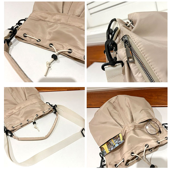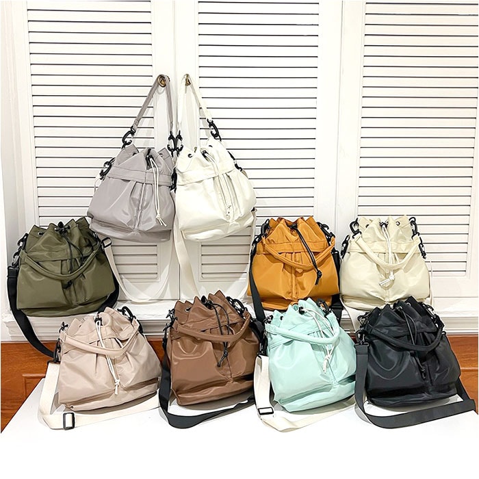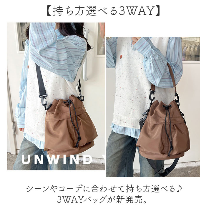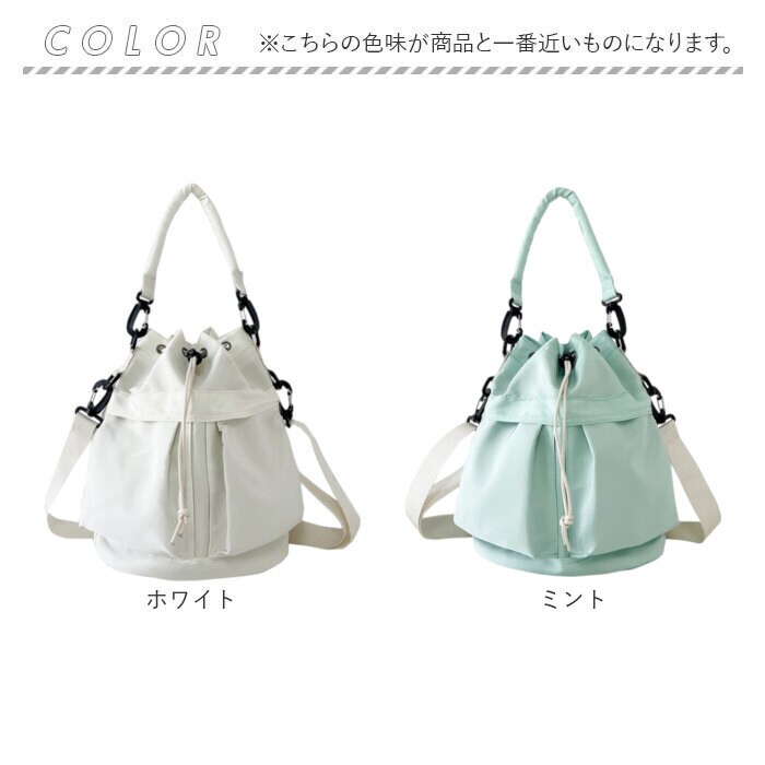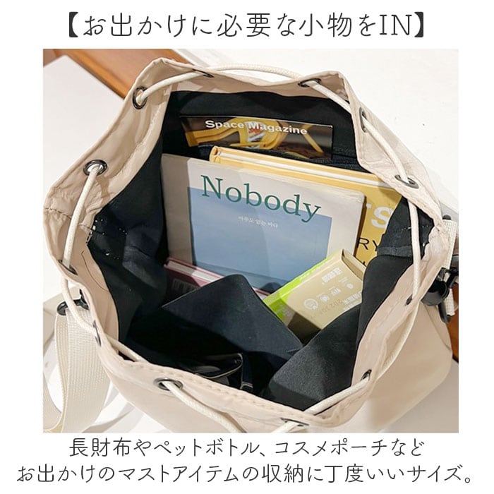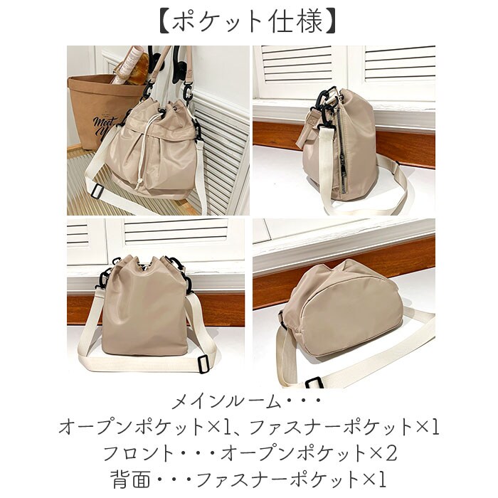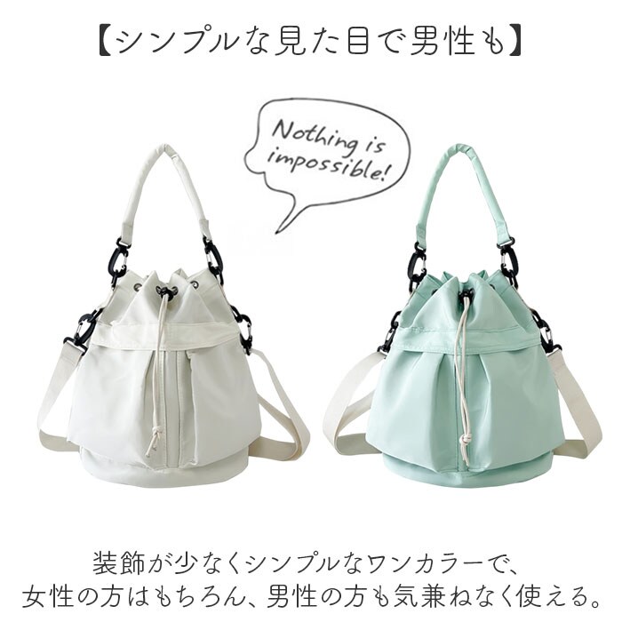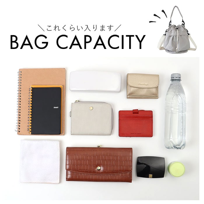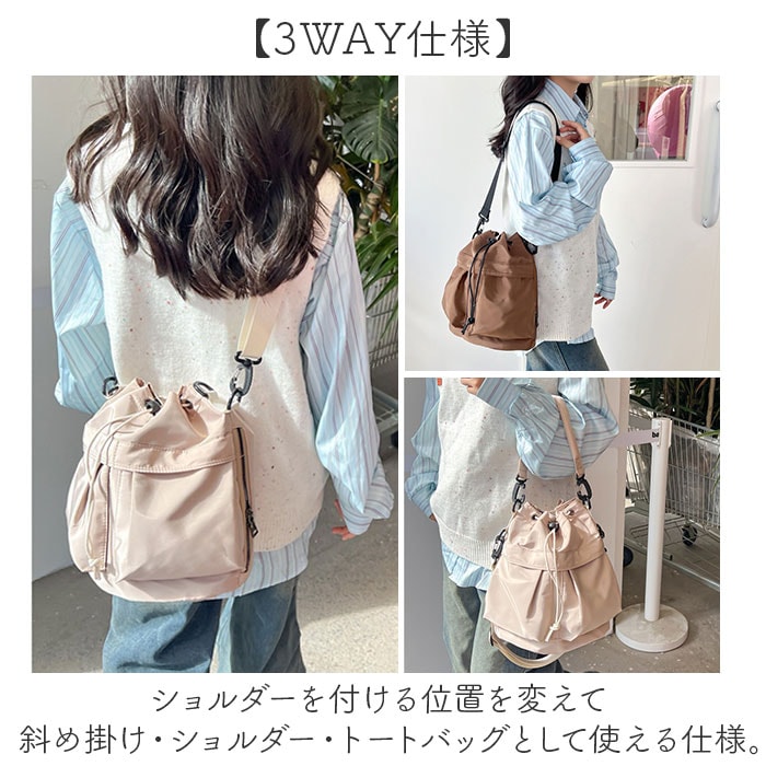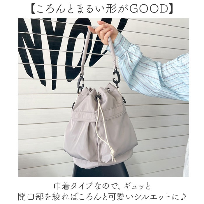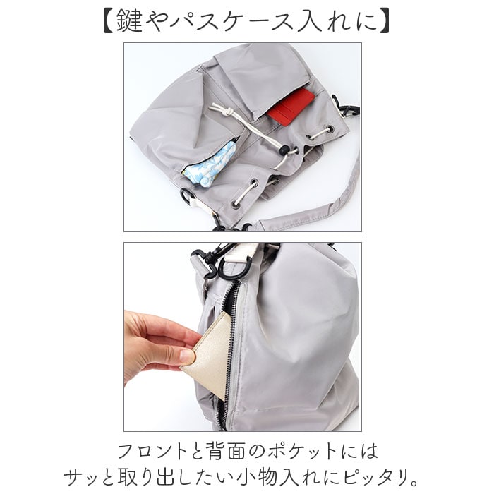 | 商品説明 | 【持ち方選べる3WAY】シーンやコーデに合わせて持ち方選べる♪3WAYバッグが新発売。【3WAY仕様】ショルダーを付ける位置を変えてリュック・ショルダー・トートバッグとして使える仕様。【お出かけに必要な小物をIN】長財布やペットボトル、コスメポーチなどお出かけのマストアイテムの収納に丁度いいサイズ。【鍵やパスケース入れに】フロントと背面のポケットにはサッと取り出したい小物入れにピッタリ。【ころんとまるい形がGOOD】巾着タイプなので、ギュッと開口部を絞ればころんと可愛いシルエットに♪【シンプルな見た目で男性も】装飾が少なくシンプルなワンカラーで、女性の方はもちろん、男性の方も気兼ねなく使える。【ポケット仕様】メインルーム・・・オープンポケット×1、ファスナーポケット×1フロント・・・オープンポケット×2背面・・・ファスナーポケット×1 |