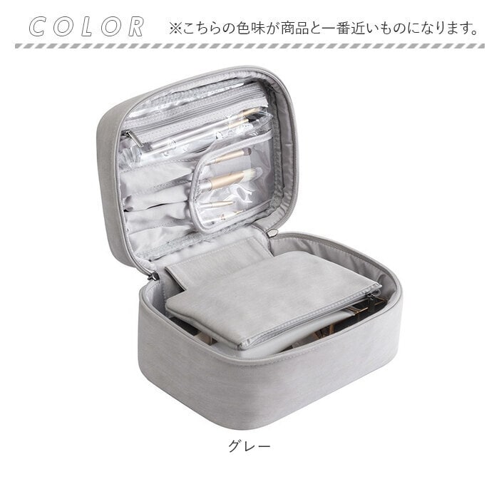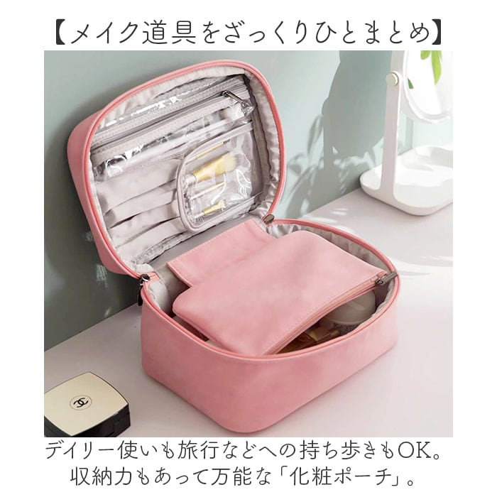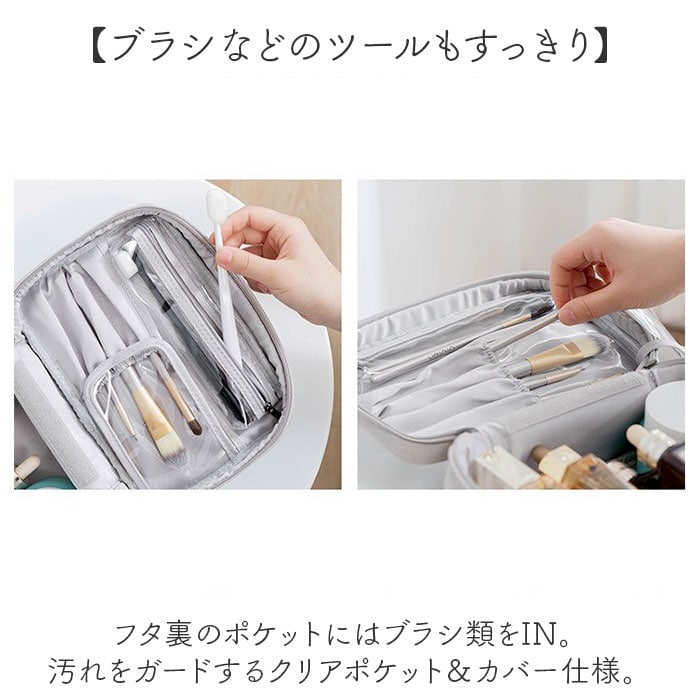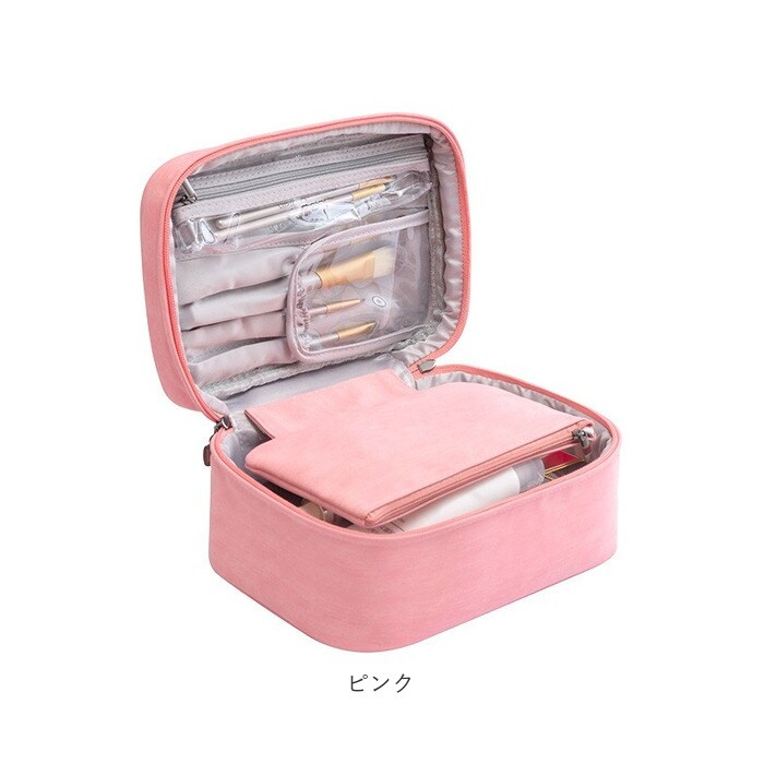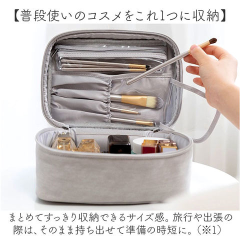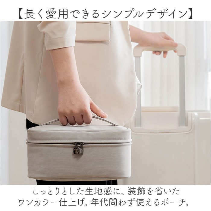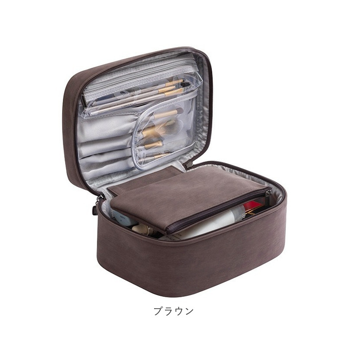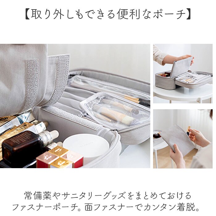 | 商品説明 | 【メイク道具をざっくりひとまとめ】デイリー使いも旅行などへの持ち歩きもOK。収納力もあって万能な「化粧ポーチ」。【普段使いのコスメをこれ1つに収納】まとめてすっきり収納できるサイズ感。旅行や出張の際は、そのまま持ち出せて準備の時短に。(※1)上部に持ち手付きです。【ガバっと開いて取り出しラクラク】ダブルファスナーで左右どちらからも180度オープン。中身を見つけやすく出し入れスムーズ◎【色んなサイズのコスメを収納】安定感のあるボックス型。ちょこっと高さのあるパウダーなども収まるつくり。【ブラシなどのツールもすっきり】フタ裏のポケットにはブラシ類をIN。汚れをガードするクリアポケット&カバー仕様。【中身を守るクッション性】本体と裏地の間に、ソフトクッションを内蔵。収納物を衝撃からガード。【水回りでも慌てない撥水性をプラス】汚れや水滴をサッと弾く、撥水加工済み。お手入れも拭き取るだけ。(※2)完全防水仕様ではありません。【取り外しもできる便利なポーチ】常備薬やサニタリーグッズをまとめておけるファスナーポーチ。面ファスナーでカンタン着脱。【長く愛用できるシンプルデザイン】しっとりとした生地感に、装飾を省いたワンカラー仕上げ。年代問わず使えるポーチ。【ポケット仕様】内側フタ裏:ファスナー式クリアポケット×1、ギャザーホルダー×4(背面クリア仕様&カバー付き) |