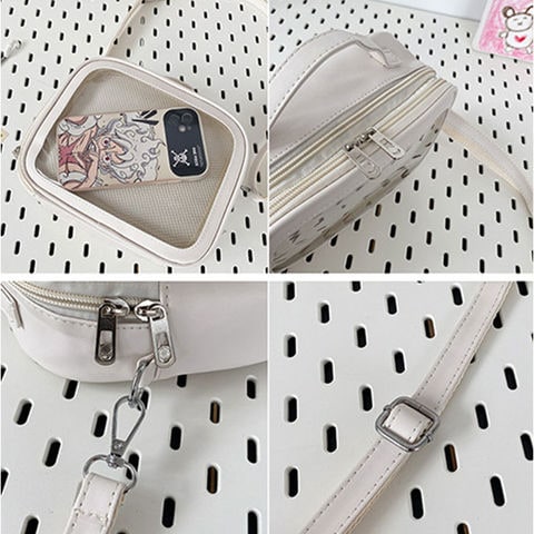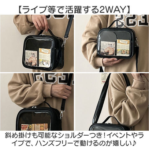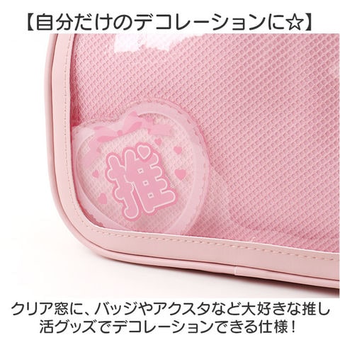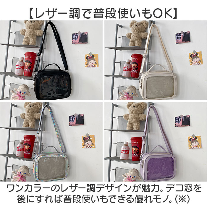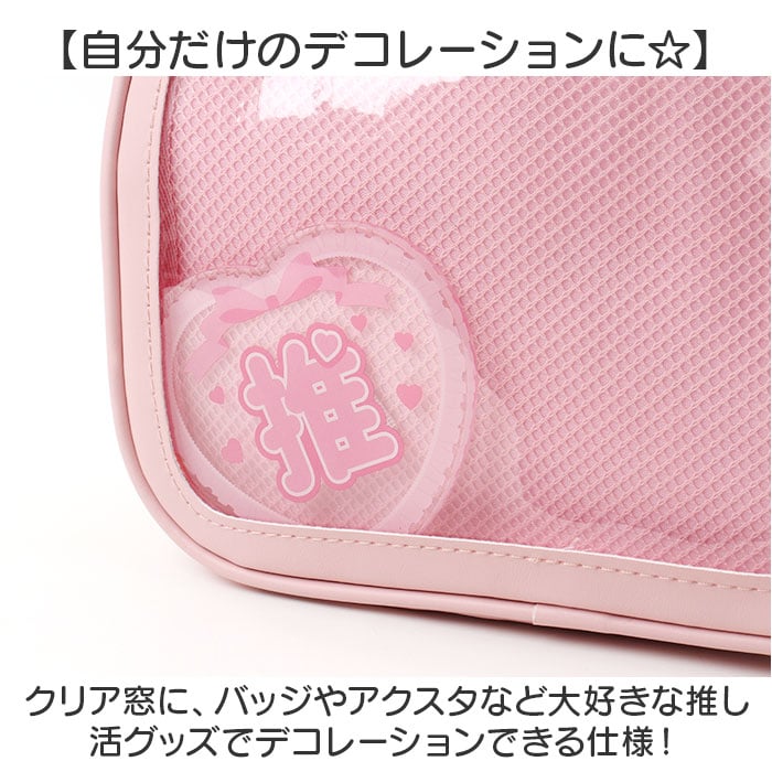 | 商品説明 | 【普段使いもできる推し活グッズ】普段使いも推し活もお任せ☆ミニマルに持てる痛バッグが新発売。【自分だけのデコレーションに☆】クリア窓に、バッジやアクスタなど大好きな推し活グッズでデコレーションできる仕様!【バッグを傷つけないプレート】バッジを刺せる専用のメッシュプレート付き。バッグを傷つけないのも嬉しいポイント。【ストラップが付けられるDカン】クリア窓のポケットにはDカンも搭載し、ストラップやキーホルダーを飾るのに便利◎【レザー調で普段使いもOK】ワンカラーのレザー調デザインが魅力。デコ窓を後にすれば普段使いもできる優れモノ。※(※)カラーによりエナメル調やマット調など合皮の質感が異なります。【マストなアイテムをIN】お財布やコスメポーチ、手帳などマストなアイテムが入るサイズ☆【小物収納ポケットも搭載】外側と内側に小物収納ポケットを搭載し、チケットなどすぐに取り出したい小物をIN【ライブ等で活躍する2WAY】斜め掛けも可能なショルダーつき!イベントやライブで、ハンズフリーで動けるのが嬉しい♪【流行りの見せる収納にも】推しグッズの他、スマホやミニポーチなどを入れてトレンドな見せる収納にもオススメ♪【ポケット仕様】メイン収納・・・オープンポケット×1フロント・・・ファスナーポケット×1(クリア窓仕様)背面・・・ファスナーポケット×1 |