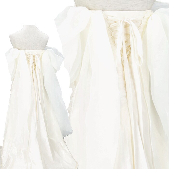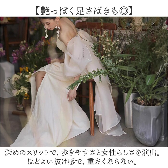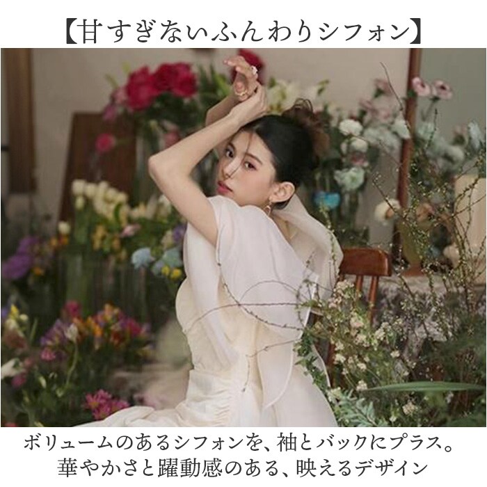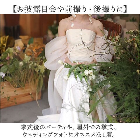 | 商品説明 | 【ふわっと可憐なオフショルドレス♪】凛とした美しさを引き立てる「ウェディングドレス」が登場。【こなれた印象のオフショルタイプ】背中やデコルテを美しく魅せる、オフショルデザインが人気の秘密。定番だけど今っぽい♪【甘すぎないふんわりシフォン】ボリュームのあるシフォンを、袖とバックにプラス。華やかさと躍動感のある、映えるデザイン【そのまま着られる作り】バストをしっかり支える、パットつき仕様。そのまま着られるからお着換えも簡単。【自分サイズにフィット】背面はコルセットのような編み上げデザイン。美しさはもちろん、自分サイズに調節可能。【艶っぽく足さばきも◎】深めのスリットで、歩きやすさと女性らしさを演出。ほどよい抜け感で、重たくならない。【お披露目会や前撮り・後撮りに】挙式後のパーティや、屋外での挙式、ウェディングフォトにオススメな1着。 |