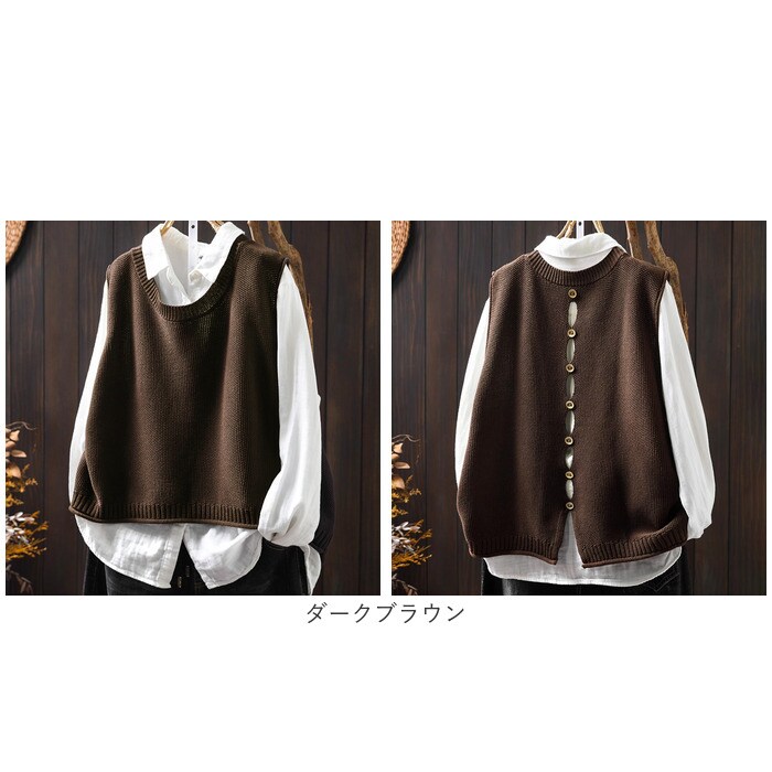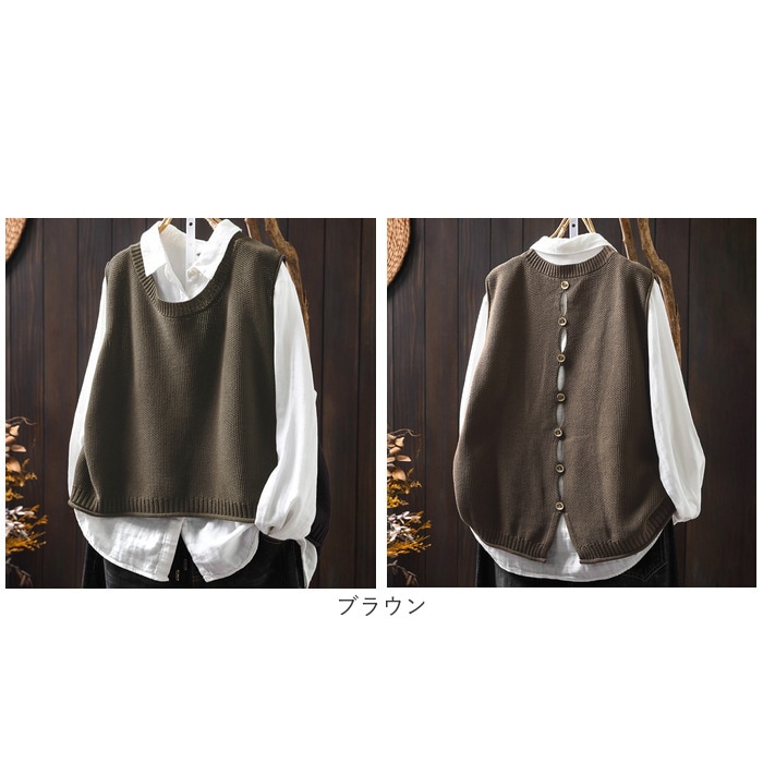 ニットベスト バックボタン レディース オールシーズン ゆったり【ブラウン】