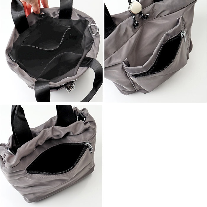 巾着バッグ ショルダー フロントファスナーポケット 2way【グレー】