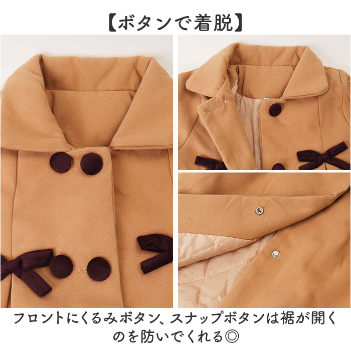| 商品説明 | 【映えるコート】普段着からフォーマルまで、幅広く活躍する頼れる1着♪【女の子らしいライン】Aラインに広がるシルエットが上品で可愛らしい印象に。【秋冬の寒さ対策に】内側はキルティング仕様。保温性があり肌寒い日も安心。【便利なポケット付き】左右にポケットが付いているから、ハンカチや小物を入れられて実用的。【ボタンで着脱】フロントにくるみボタン、スナップボタンは裾が開くのを防いでくれる◎ |
