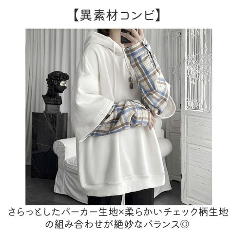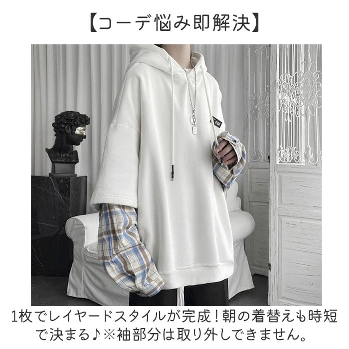 パーカー 重ね着 チェック柄 フード付き 男女兼用【ホワイト】【M】