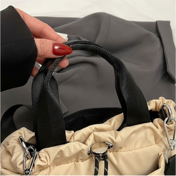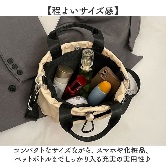 | 商品説明 | 【2WAYでいつでも活躍】軽くて撥水、通勤も休日もこれ一つで完璧な2wayトート【シーンによって使い分け】ショルダーとハンドバッグの2WAYで使える便利な設計で、シーンに合わせてスタイルチェンジできる自由さ◎【撥水素材で雨も安心】撥水ナイロン素材だからちょっとした雨でも慌てず、お天気を気にせず気軽に持ち歩ける頼もしさ♪【5つのポケット充実】フロントとバックに計3ポケット、内側に2ポケットで小物をスッキリ整理できる抜群の収納力〇【マグネット開閉】開口部はマグネットボタンでワンタッチ開閉、スムーズな出し入れでストレスフリーな使い心地!【軽量で疲れ知らず】ナイロンの軽やかさで長時間持っても肩や腕に負担がかかりにくく、快適に過ごせる嬉しい設計。【程よいサイズ感】コンパクトなサイズながら、スマホや化粧品、ペットボトルまでしっかり入る充実の実用性♪ |