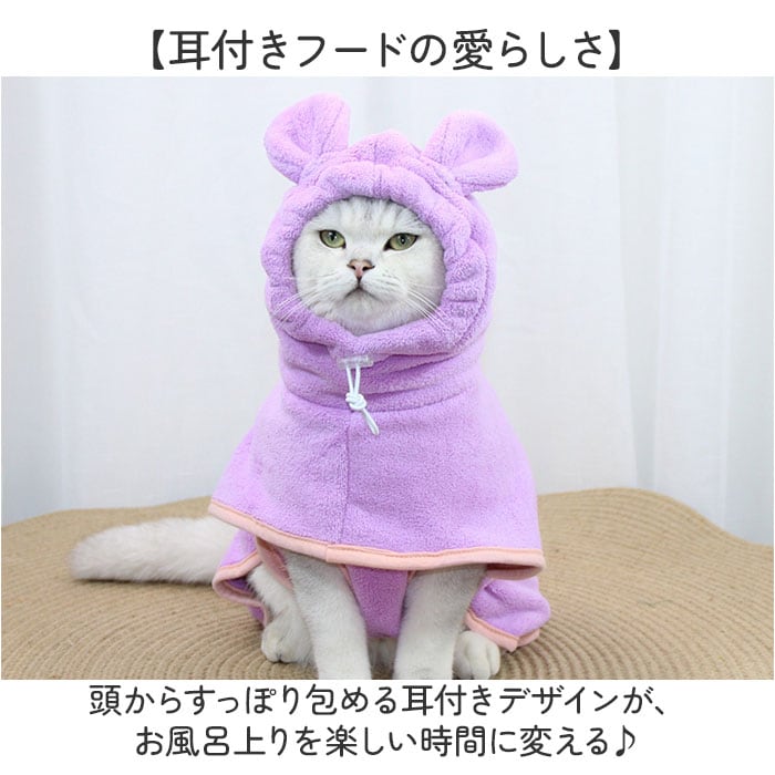 | 商品説明 | 【お風呂上りを快適に】吸水速乾で愛犬愛猫を優しく包むバスローブ。【快適な使い心地】お風呂上りの水分をしっかり吸収し、すぐ乾くポリエステル素材◎【ドロストで細かく調整】顔まわりと胴の長さを絞れるドロスト付きで、ペットの体型にぴったり合わせられる〇【ベルトでしっかり固定】体に巻き付けて留められるベルトが、動いてもずれにくい安心感を実現。【耳付きフードの愛らしさ】頭からすっぽり包める耳付きデザインが、お風呂上りを楽しい時間に変える♪【足を通せるゴムで安定感】動いてもずれにくく防寒対策にも役立つ。 |