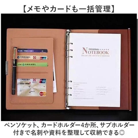 | 商品説明 | 【仕事効率を格上げする手帳カバー】A5サイズでビジネスバッグにすっきり収まる、スマートなシステム手帳カバー。【メモやカードも一括管理】ペンソケット、カードホルダー4か所、サブホルダー付きで名刺や資料を整理して収納できる◎【高級感ある本革風の質感】PUレザー使用で本革のような美しい仕上がりと耐久性を両立した上質なカバーデザイン。【自由にカスタマイズ可能】6穴式バインダーで中の用紙を入れ替え、用途に合わせて自分好みにアレンジして長く愛用できる〇(※中身の一部は中国語表記になります。)【開閉スムーズな合金式】合金バインダー採用で開閉しやすく、高品質紙との組み合わせで書き心地も快適♪ |
