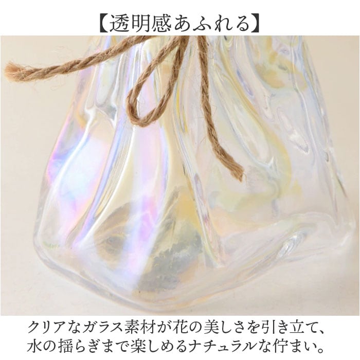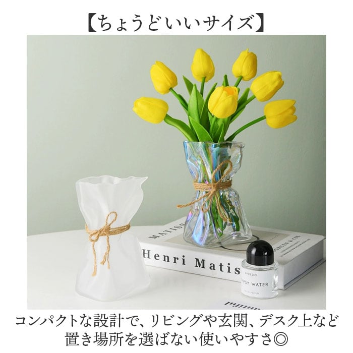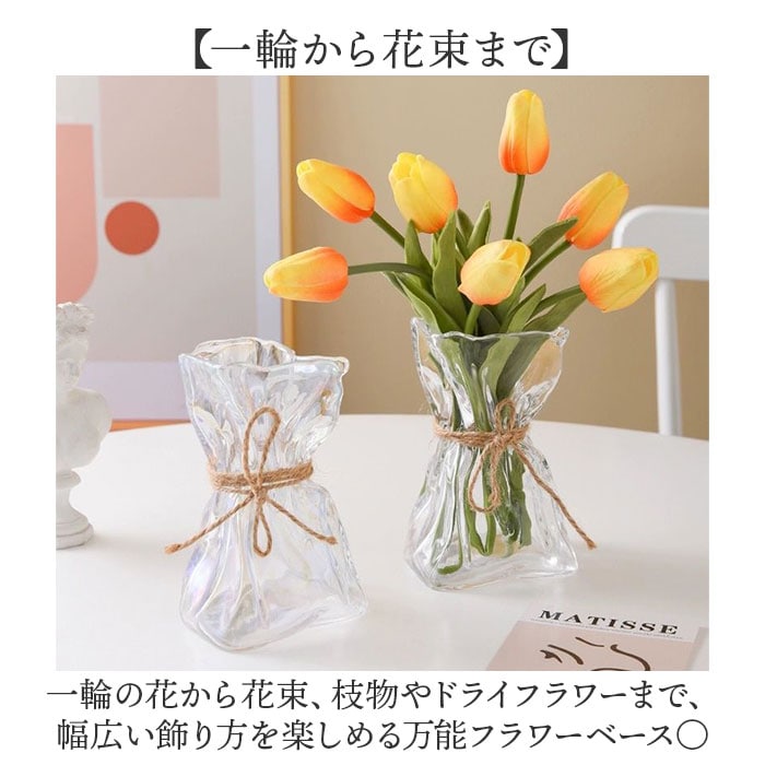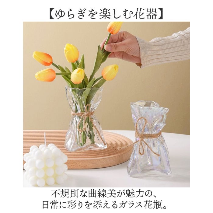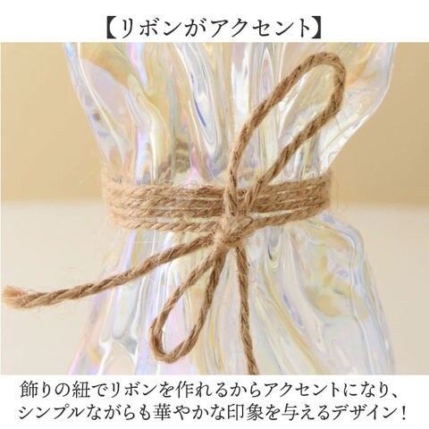 | 商品説明 | 【ゆらぎを楽しむ花器】不規則な曲線美が魅力の、日常に彩りを添えるガラス花瓶。【ランダムシェイプ】不揃いな曲線美がまるでアート作品のように美しく、置くだけで空間が洗練される印象的な花瓶♪【一輪から花束まで】一輪の花から花束、枝物やドライフラワーまで、幅広い飾り方を楽しめる万能フラワーベース〇【透明感あふれる】クリアなガラス素材が花の美しさを引き立て、水の揺らぎまで楽しめるナチュラルな佇まい。【ちょうどいいサイズ】コンパクトな設計で、リビングや玄関、デスク上など置き場所を選ばない使いやすさ◎【リボンがアクセント】飾りの紐でリボンを作れるからアクセントになり、シンプルながらも華やかな印象を与えるデザイン! |