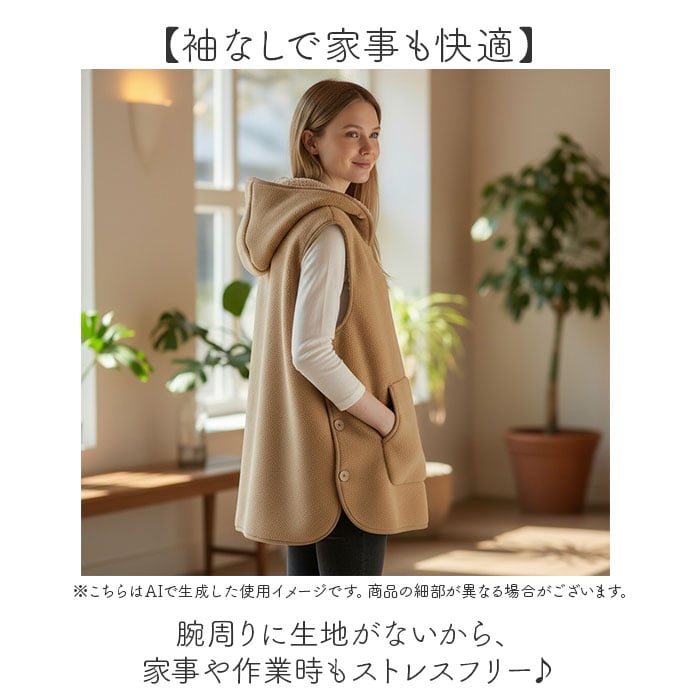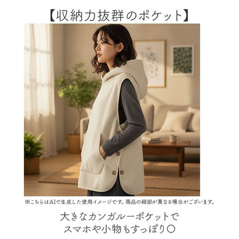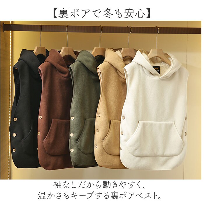 | 商品説明 | 【裏ボアで冬も安心】袖なしだから動きやすく、温かさもキープする裏ボアベスト。【袖なしで家事も快適】腕周りに生地がないから、家事や作業時もストレスフリー♪【ふわっふわの裏ボア仕様】内側は暖かいボア素材で、寒い冬でも心地よく過ごせる◎【フード付きで防寒力】頭や耳までカバーするフードが、冷気から優しく守ってくれる〇【サイドボタンで着やすさUP!】木製ボタンがナチュラルな雰囲気と脱ぎ着の快適さを両立◎【収納力抜群のポケット】大きなカンガルーポケットでスマホや小物もすっぽり〇 |