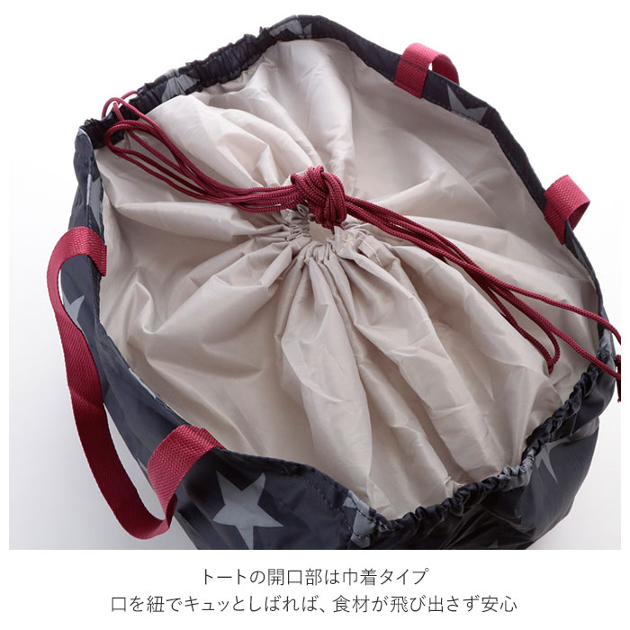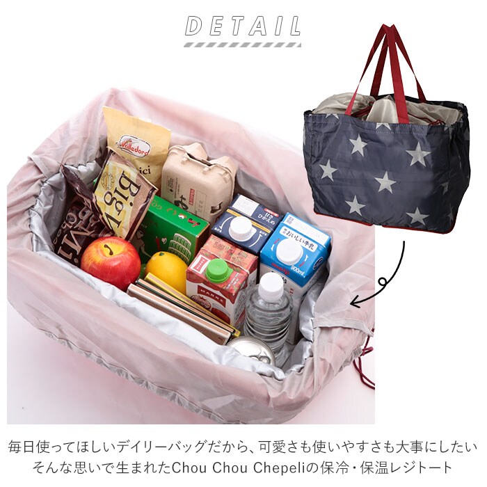 | 商品説明 | 毎日使ってほしいデイリーバッグだから、可愛さも使いやすさも大事にしたい…。そんな思いで生まれたChou Chou Chepeliの保冷保温レジトート。レジカゴにサッと広げれば、巾着部分がカゴのフチにぴったりフィット!お会計後は紐をしばって取り出すだけで、袋詰めの手間が省けて楽ちん。トートの開口部は巾着タイプ。口を紐でキュッとしばれば、たっぷりのお買い物したときも食材が飛び出さず安心。週末のまとめ買いにも余裕で対応できる大容量サイズ!大きめの野菜や果物、ペットボトルもしっかり入る。トート内側の生地には、シルバーコーティング加工されたポリエステル生地を使用して保冷効果UP!エコバッグとしてだけでなく、キャンプやBBQでの食材の持ち運びにも大活躍!長めにデザインされた持ち手ハンドルで、肩に通して持ちやすい♪重くなった荷物もラクラク持ち運び。トートの生地を内側に折りたたんで、底板ごと二つに折れば、ファスナーポーチに変身!便利な持ち手付きでコンパクトに持ち運べる! |