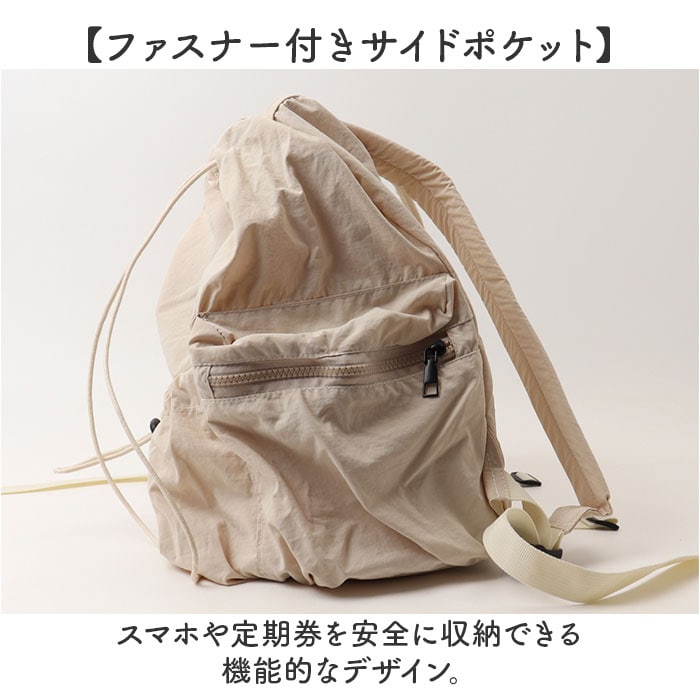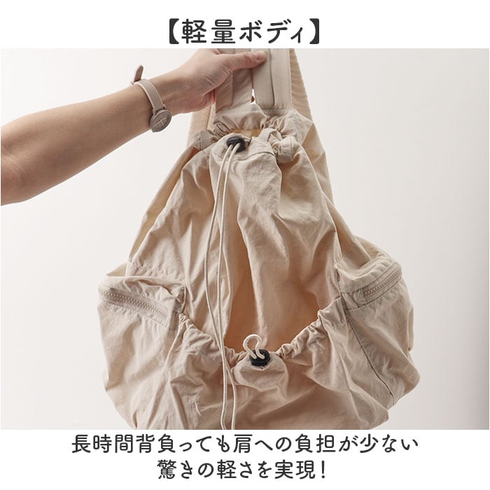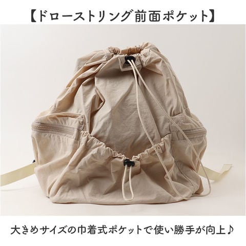 | 商品説明 | 【毎日を自由に楽しむ相棒リュック】通学も遊びも、軽やかに持ち歩けるおしゃれな実力派。【巾着風の愛らしいシルエット】ドローストリングを絞れば丸みのある可愛いフォルムに変身♪【大きく開く巾着式開閉】トップを緩めれば中身が一目瞭然で出し入れもスムーズに◎【A4サイズもすっぽり収納】A4ノートやポーチなど楽々収まる頼もしい収納力を実現◎【ファスナー付きサイドポケット】スマホや定期券を安全に収納できる機能的なデザイン。【ドローストリング前面ポケット】大きめサイズの巾着式ポケットで使い勝手が向上♪【調節可能な肩紐で快適フィット】体型に合わせて長さを変えられるから疲れにくい仕様〇【軽量ボディ】長時間背負っても肩への負担が少ない驚きの軽さを実現! |