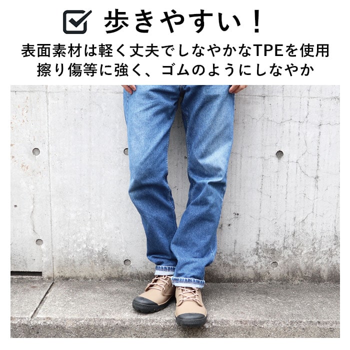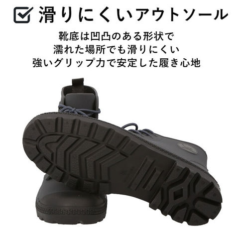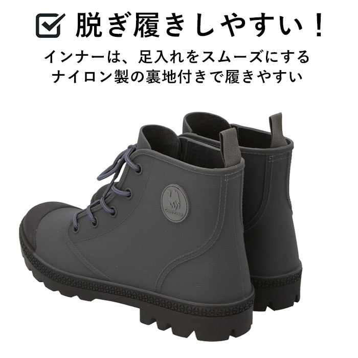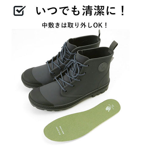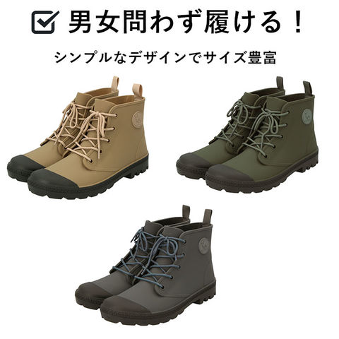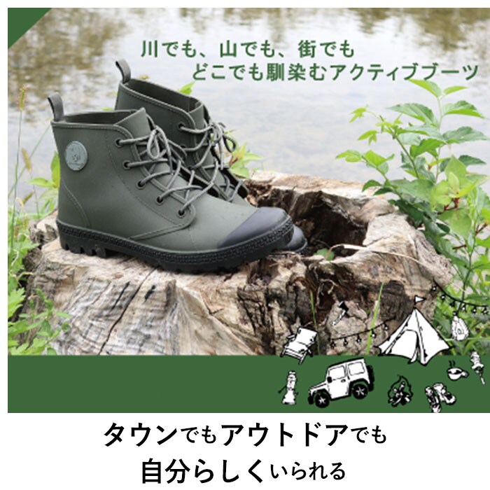 | 商品説明 | 川でも、山でも、街でも!Green camelから、どこでも馴染むアクティブブーツの登場♪アウトドアから、タウンユースまで、幅広く着用可能で、様々なファッションに合う♪表面素材には、軽く丈夫でしなやかなTPEを使用。擦り傷等に強く、ゴムのようにしなやか。アウトソールはタイルなどでも滑りにくいパターンを採用しており、底から高さ7cmくらいまで完全防水仕様!インナーは、足入れをスムーズにするナイロン製の裏地付きで履きやすい。クッション性のあるインソールは疲れにくく、快適な履き心地。女性も男性も履けちゃう、アクティブレインブーツ! |