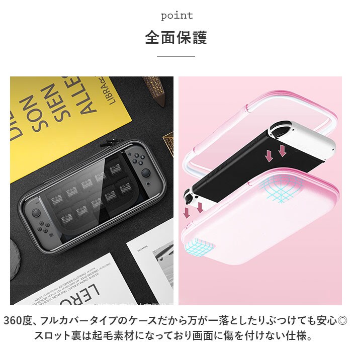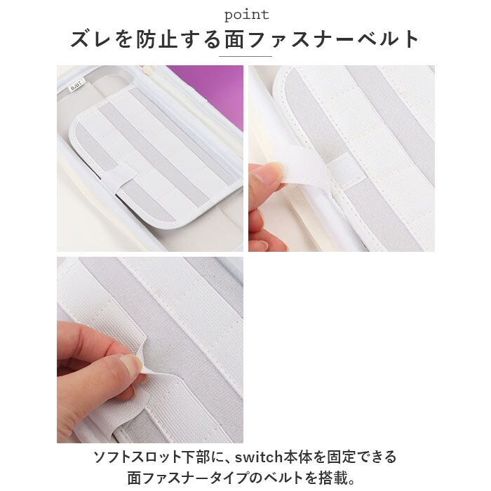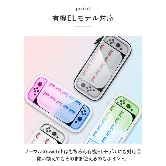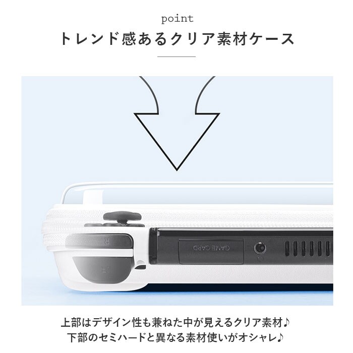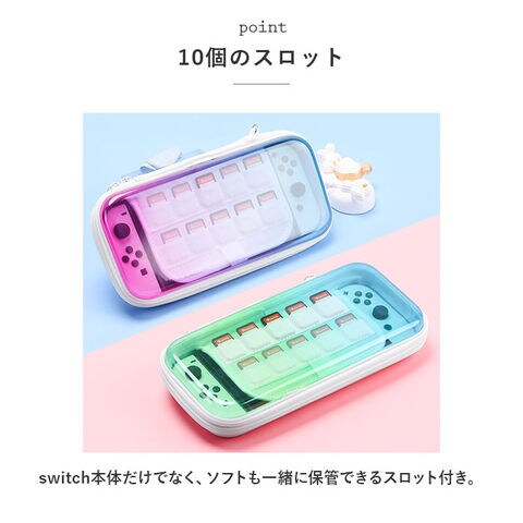 | 商品説明 | ソフトとswitch本体を1つに収納できるswitchケースが発売。【トレンド感あるクリア素材ケース】上部はデザイン性も兼ねた中が見えるクリア素材♪下部のセミハードと異なる素材使いがオシャレ♪【10個のスロット】switch本体だけでなく、ソフトも一緒に保管できるスロット付き。【ズレを防止する面ファスナーベルト】ソフトスロット下部に、switch本体を固定できる面ファスナータイプのベルトを搭載。【ジョイコン上部にフィットする溝】深めの溝を作ることでZR、ZLボタンを押し続けない構造に。【全面保護】360度、フルカバータイプのケースだから万が一落としたりぶつけても安心◎スロット裏は起毛素材になっており画面に傷を付けない仕様。【有機ELモデル対応】ノーマルのswitchはもちろん有機ELモデルにも対応◎買い換えてもそのまま使えるのもポイント。【ハンドストラップ】持ち運びに便利なハンドストラップ付き。手首に掛けて使うことで落下防止にもなる。【カバーを付けたままでも収納可】薄型のシリコンカバー等、switch本体にカバーを付けていてもそのまま収納OK! |