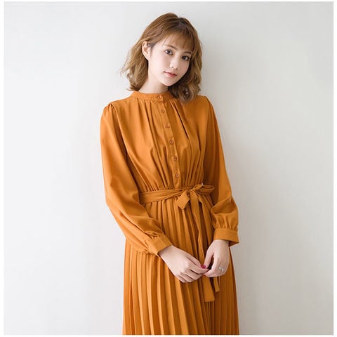 ロング ワンピース シャツ風 シフォン 長袖 gdress4137【キャラメル】【Sサイズ】