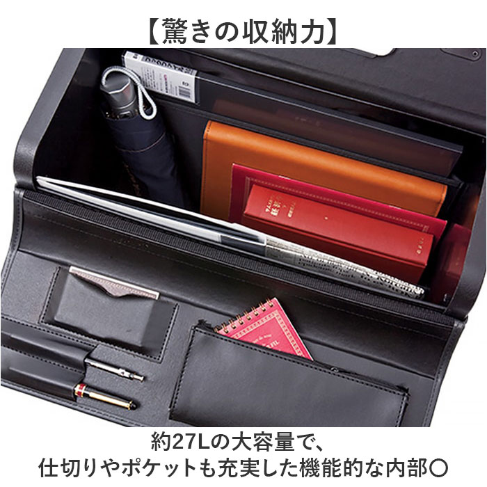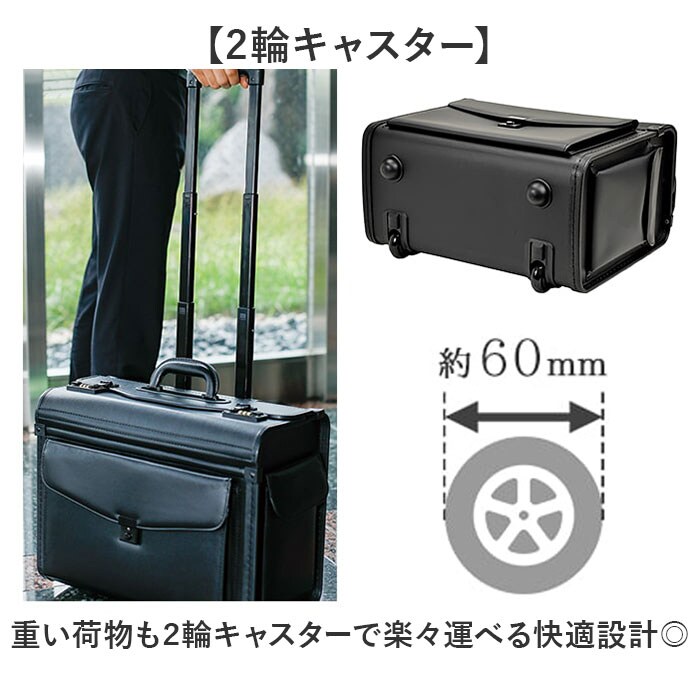 | 商品説明 | 【移動がスムーズ】書類や荷物を運ぶビジネスの相棒「2輪キャスター付きパイロットケース」【2輪キャスター】重い荷物も2輪キャスターで楽々運べる快適設計◎【B4ファイル対応】上部が大きく開き出し入れしやすく、営業や出張時の大切な書類の持ち運びに最適。【驚きの収納力】約27Lの大容量で、仕切りやポケットも充実した機能的な内部〇【安心のセキュリティ】3桁ダイヤル錠と鍵付きポケットで、大事な書類をしっかり守る!※ 誤動作防止ピン(ダイヤルに差してある赤いステック)を抜く前に、同梱の操作説明書を必ずお読みになって下さい。 【高さ調節可能】収納式キャリーバーは3段階調節で、自分に合った高さで使える♪ |