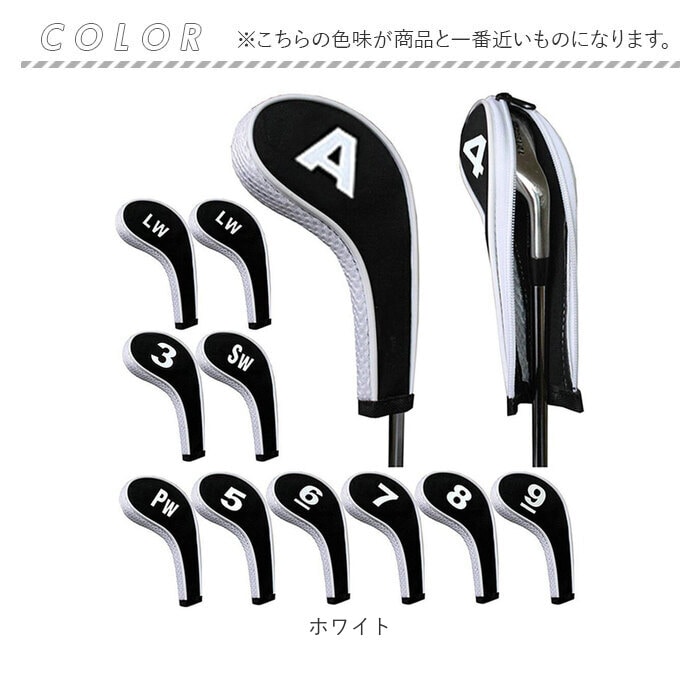 ゴルフ アイアンヘッドカバー ファスナー 12個セット ggolf6022【ホワイト】