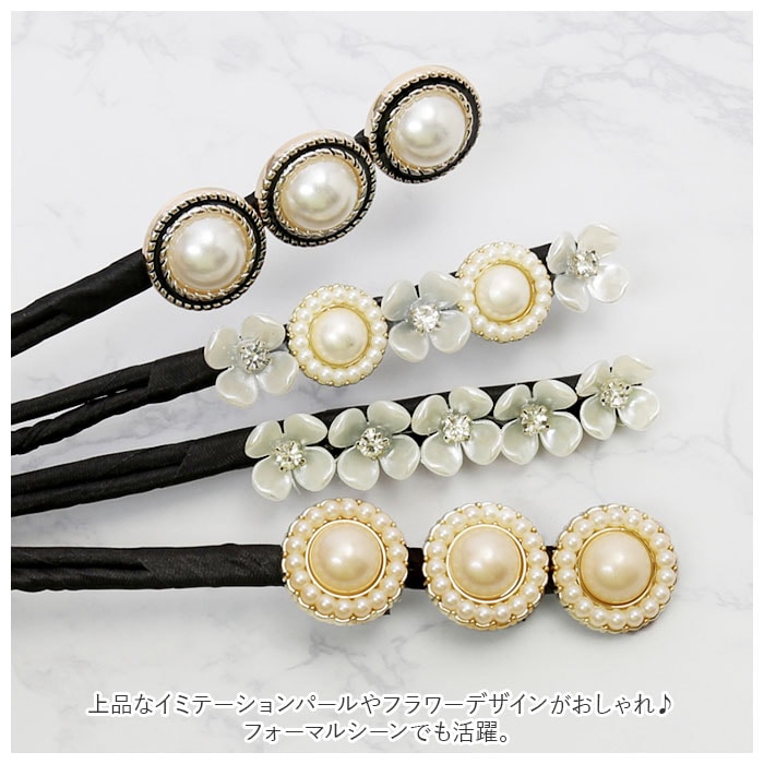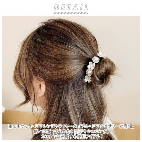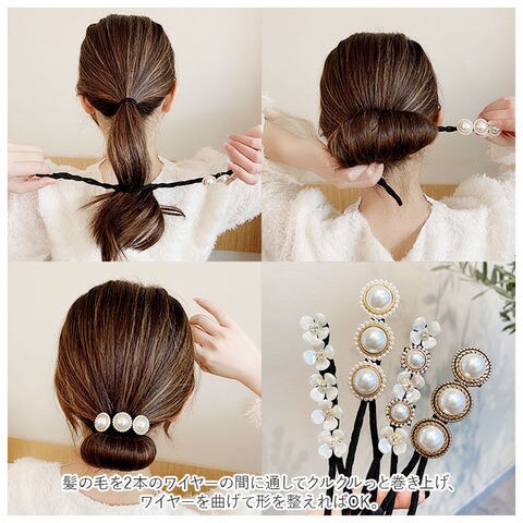 | 商品説明 | 誰でもサッとヘアアレンジ♪ワイヤータイプのヘアアクセサリーが登場。低い位置でまとめたお団子やシニヨンが、カンタンに完成する便利アイテム!髪の毛を2本のワイヤーの間に通してクルクルっと巻き上げ、ワイヤーを曲げて形を整えればOK。ヘアアレンジが苦手な方にぴったり!忙しい朝の時短ヘアアレンジも、叶っちゃう♪上品なイミテーションパールやフラワーデザインがおしゃれ♪フォーマルシーンでも活躍。 |