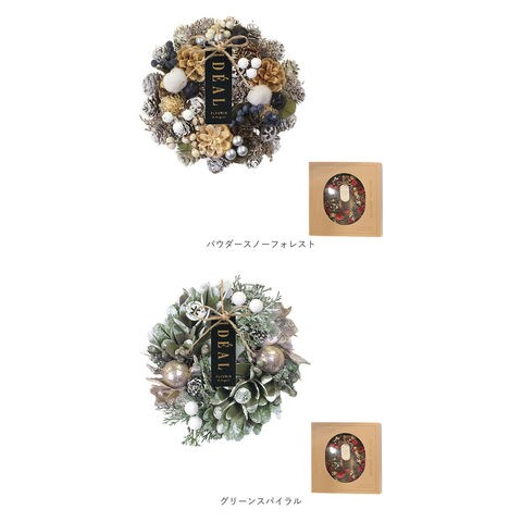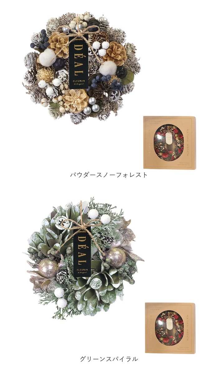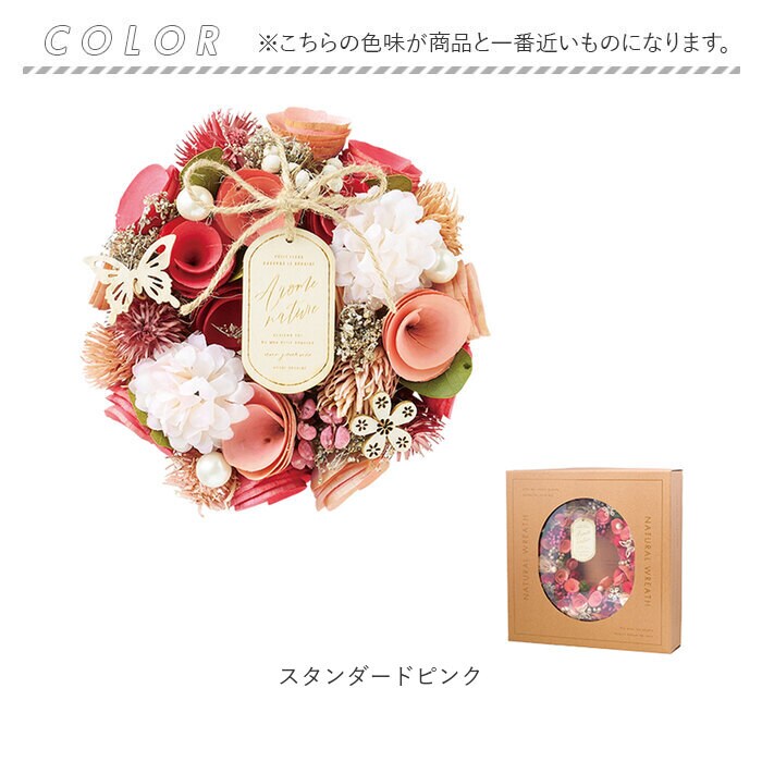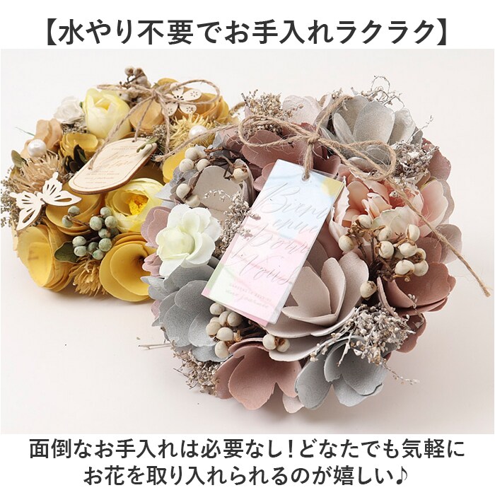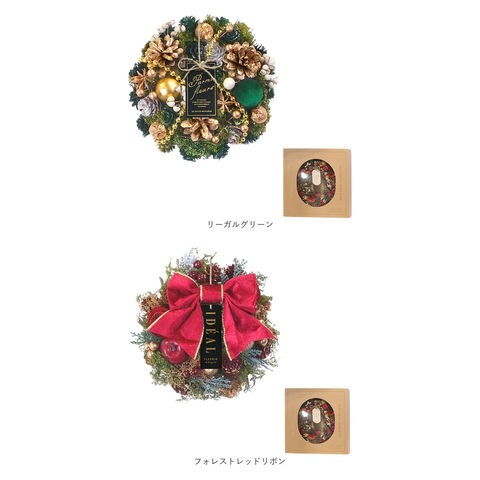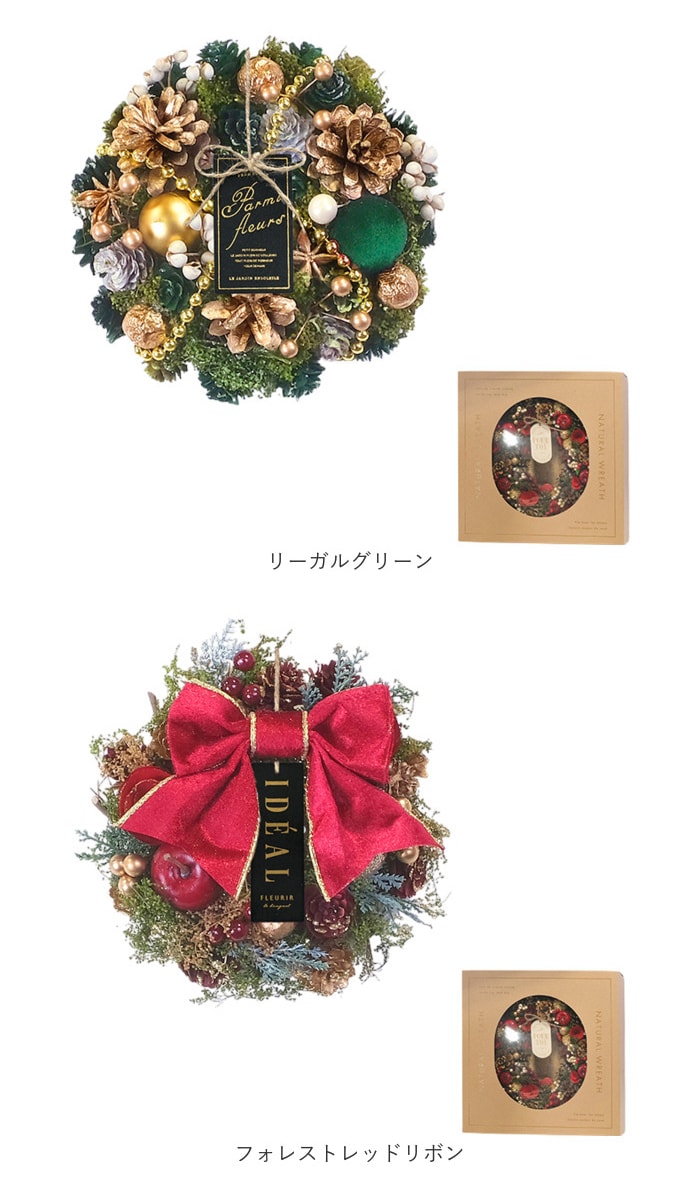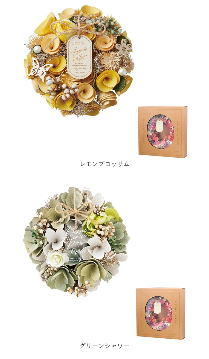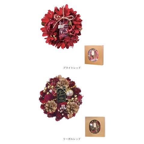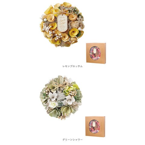 | 素材 | 天然素材、発砲スチロール、ポリエステル、木 【グリーンシャワー・シフォンピンクブルー・ブライトレッド】 天然素材、発砲スチロール、ポリエステル、ポリ塩化ビニール 紙(シフォンピンクブルーのみ) 【シャビーグリーン】 天然素材、発砲スチロール、ポリプロピレン、ポリ塩化ビニール |