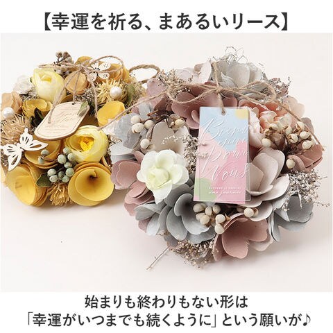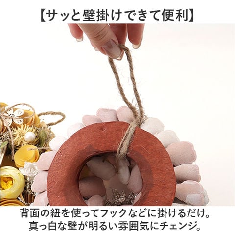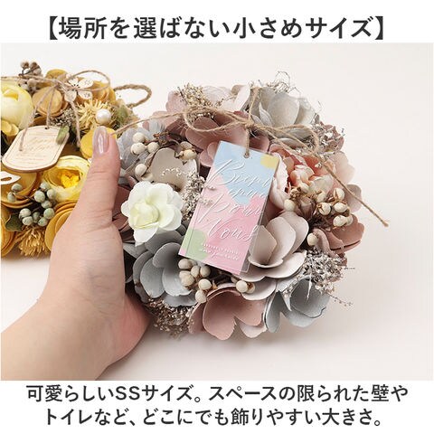 | 商品説明 | 【空間に彩りのアクセントをプラス】まるで本物の植物のような仕上がり。「ナチュラルリース」 SSサイズ。【幸運を祈る、まあるいリース】始まりも終わりもない形は「幸運がいつまでも続くように」という願いが♪【空間がパッと華やぐデザイン】天然素材などを使い、自然な風合いを生かしたデザイン。色味も可愛いミックスカラー☆(※)手作り品のため、個体差があります。【場所を選ばない小さめサイズ】可愛らしいSSサイズ。スペースの限られた壁やトイレなど、どこにでも飾りやすい大きさ。【水やり不要でお手入れラクラク】面倒なお手入れは必要なし!どなたでも気軽にお花を取り入れられるのが嬉しい♪【サッと壁掛けできて便利】背面の紐を使ってフックなどに掛けるだけ。真っ白な壁が明るい雰囲気にチェンジ。【お祝いのギフトにもおすすめ】中身が見えるクラフトボックス入り。英字新聞風の緩衝材もおしゃれで、贈り物にぴったり。 |