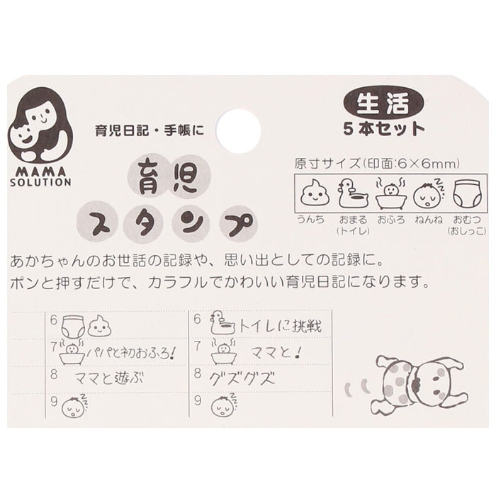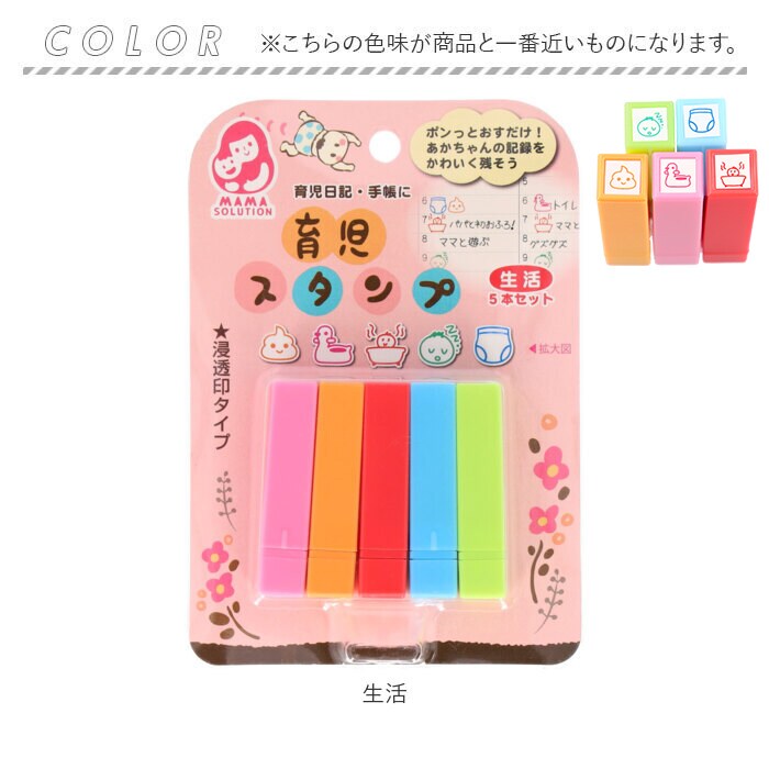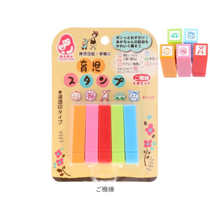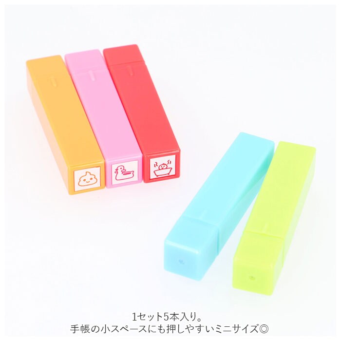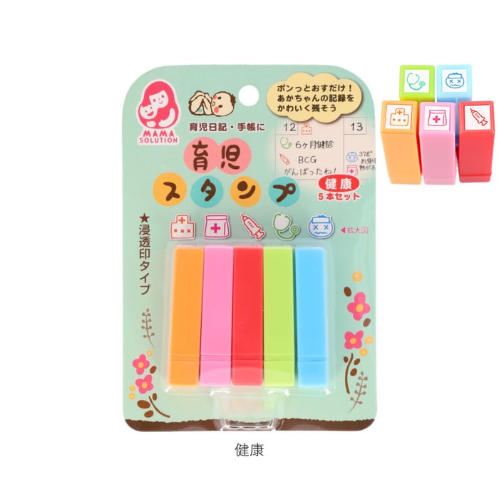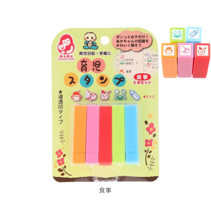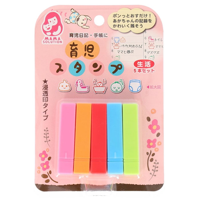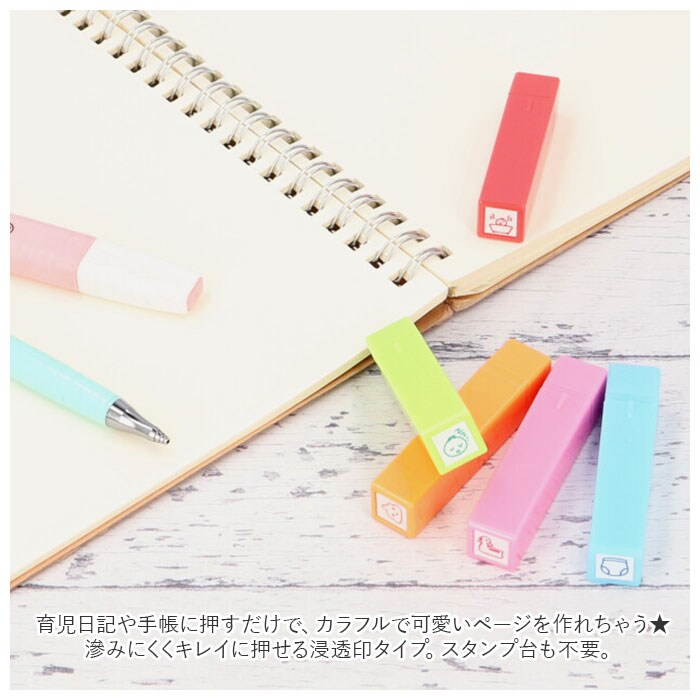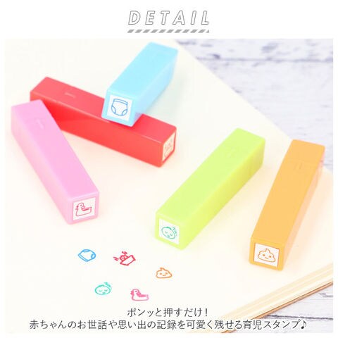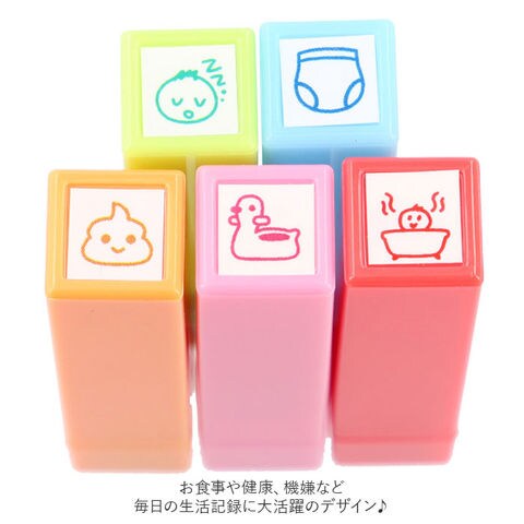 | 商品説明 | ポンッと押すだけ!赤ちゃんのお世話や思い出の記録を可愛く残せる育児スタンプ♪育児日記や手帳に押すだけで、カラフルで可愛いページを作れちゃう★滲みにくくキレイに押せる浸透印タイプ。スタンプ台も不要。・1セット5本入り。手帳の小スペースにも押しやすいミニサイズ◎お食事や健康、機嫌など毎日の生活記録に大活躍のデザイン♪ |