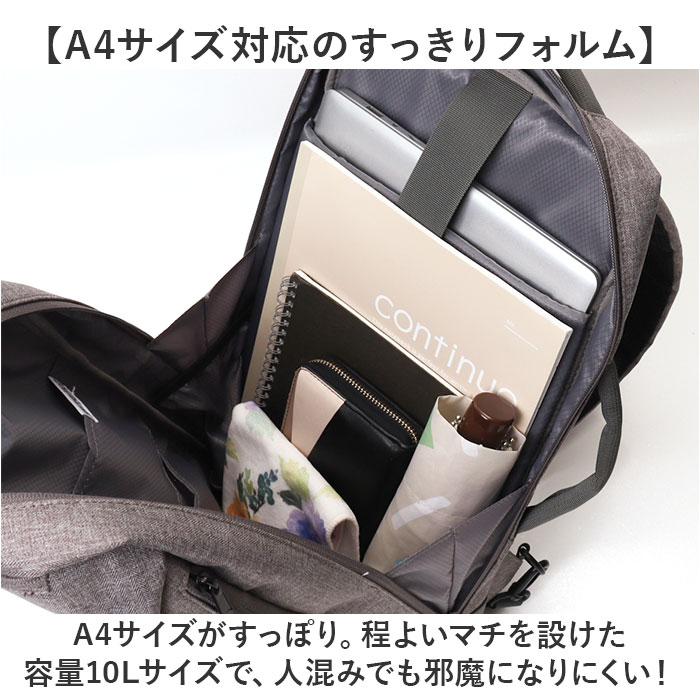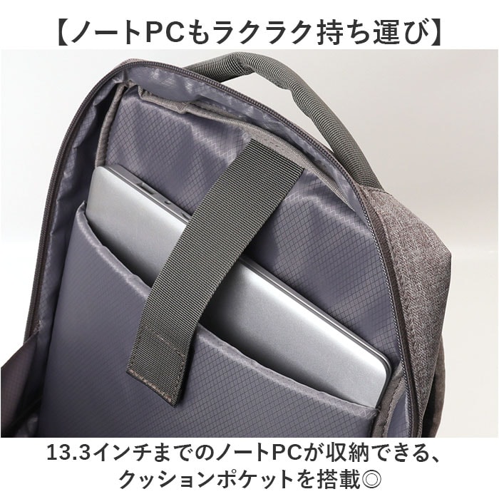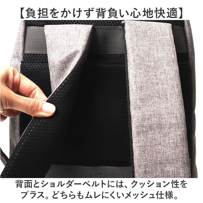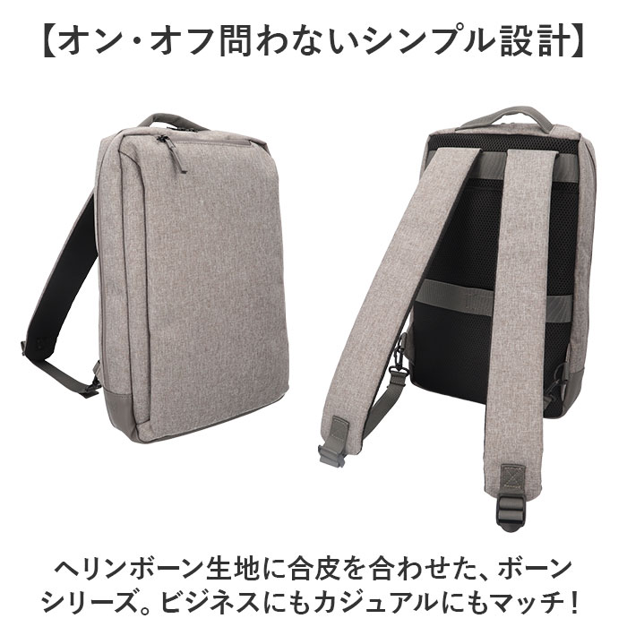 | 商品説明 | 【頼りになるお出かけの相棒☆】便利な機能性をプラス。anelloGRANDE ボーンシリーズの「多機能リュック」。【オン・オフ問わないシンプル設計】ヘリンボーン生地に合皮を合わせた、ボーンシリーズ。ビジネスにもカジュアルにもマッチ!【充実の10ポケットですっきり収納】内側・外側合わせて10個のポケットと、ボトルループを装備。サッと取り出せて、迷子知らず。【開閉スムーズなダブルファスナー】左右どちらからもオープン!出し入れしやすく、ファスナーを閉じれば、プライバシーも確保◎【A4サイズ対応のすっきりフォルム】A4サイズがすっぽり。程よいマチを設けた容量10Lサイズで、人混みでも邪魔になりにくい!【ノートPCもラクラク持ち運び】・13.3インチまでのノートPCが収納できる、クッションポケットを搭載◎【負担をかけず背負い心地快適】背面とショルダーベルトには、クッション性をプラス。どちらもムレにくいメッシュ仕様。【お好みに合わせてスタイルチェンジ】ショルダーを背面ポケットに入れて、横向きに手持ちも自在な2way仕様。(※1)上部のハンドルを使うことも可能です。【キャリーオンOKで移動もスマート】背面の面ファスナー式テープをキャリーケースのバーに通すことができる、キャリーオンタイプ。【ちょっとの雨なら大丈夫】汚れや水滴を弾きやすい撥水加工済み。お手入れも拭き取るだけ。(※2)完全防水ではありません。【お揃いで持てるユニセックス仕様】年代や性別問わず持ちやすい、ベーシックカラー。色違いで揃えたり、家族でシェアも。【ポケット仕様】内側:面ファスナーベルト式クッションポケット×1、オープンポケット×3、ペンポケット×3、前面:ファスナーポケット×1、縦型ファスナーポケット×1背面:面ファスナーポケット×1(ショルダー収納可能) |
