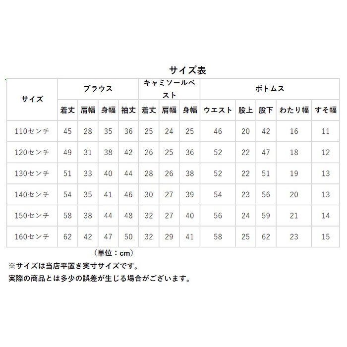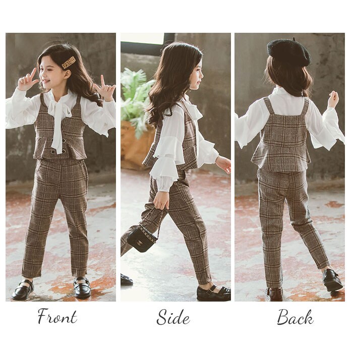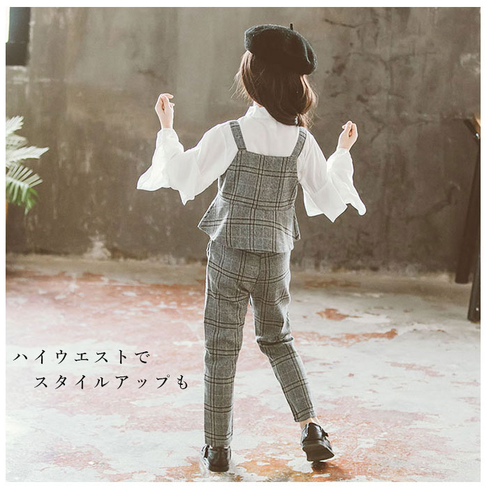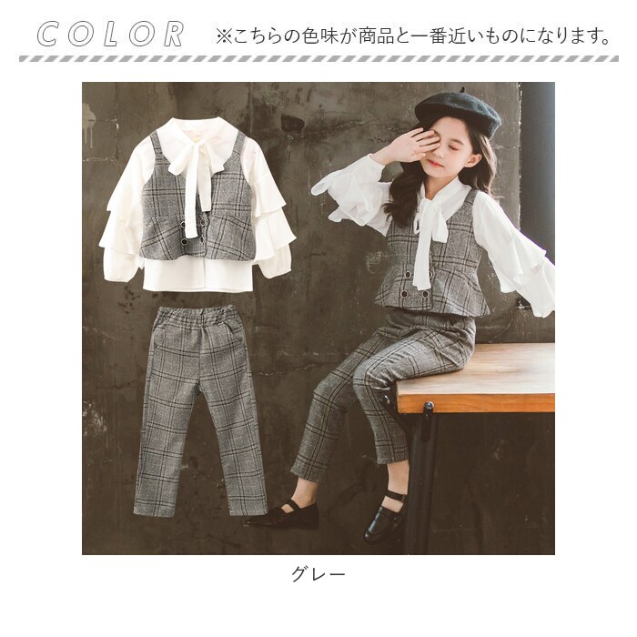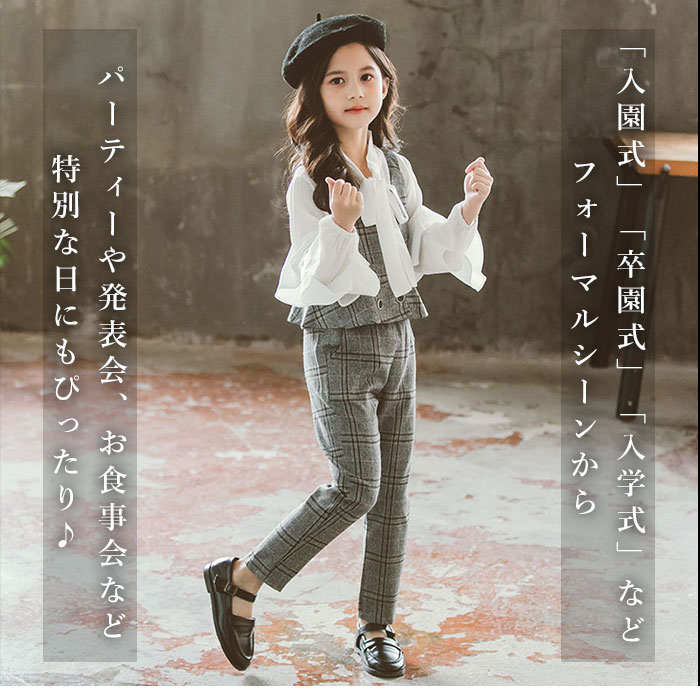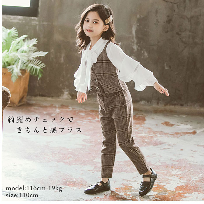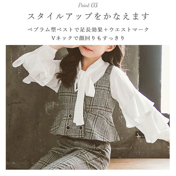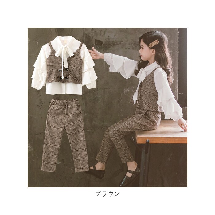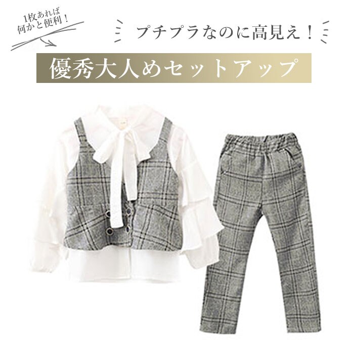 商品説明カジュアルにもフォーマルにも使える♪キッズ用セットアップ 3点セットが発売。ブラウス、キャミソールベスト、パンツの3点セット。これだけでおしゃれコーデが完成!キャミソールベストとパンツは、大人っぽいトラッドなチェック柄で知的な雰囲気を演出。顔周りを華やかに見せてくれるボウタイブラウス。腕周りにはフリルデザインが施され、可愛らしい印象に。キャミソールベストは裾部分がふんわり広がるデザイン。パンツは締めつけ感のない履き心地で、脱ぎ着も楽ちんなウエストゴム仕様。両サイドには、薄手のハンカチなどを入れておけるポケット付き。入学式・卒業式、発表会などで活躍!セットではもちろん、単体でカジュアルに普段使いしてもOK。