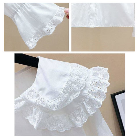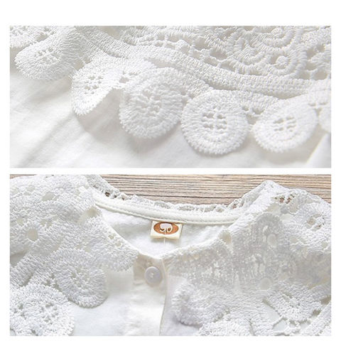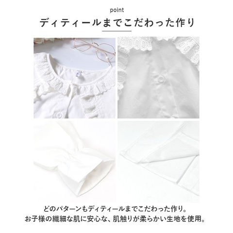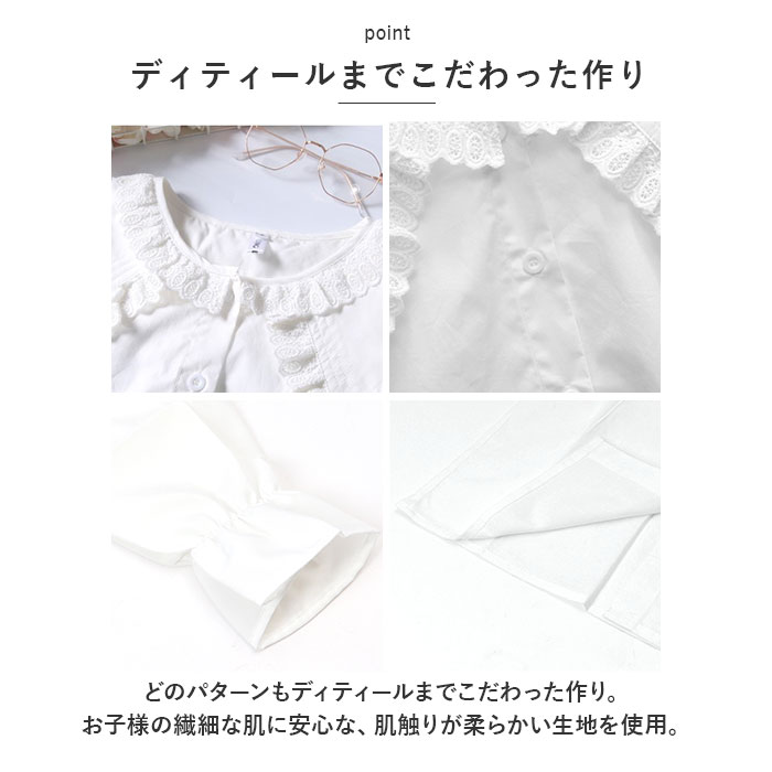 | 商品説明 | フォーマルにも使えるキッズブラウスが発売♪シンプルな白ブラウスにフリルやレース等の組み合わせた女の子が喜ぶデザイン♪計3パターンのラインナップ☆お気に入りのデザインがチョイス可能。どのパターンもディティールまでこだわった作り。お子様の繊細な肌に安心な、肌触りが柔らかい生地を使用。普段使いにはもちろん華やかなフォーマルシーンや撮影にもピッタリなアイテム。 |