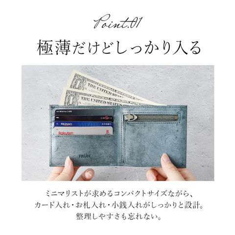 | 商品説明 | 薄さ8mm!軽くてスマートな、FRUH ショートウォレットブライドルレザーとは…牛革に、耐久性を高めるために何度もロウを塗り込み、繊維を引き締めている。そのため、表面にはロウが染み出した白い粉がふいているように見えるが、これもブライドルレザーならではの特徴。ロウをしっかりと染み込ませているため、革に水分が浸透しにくいという性質がある。一番薄い部分で厚みが約8mmと、とてもスマート。ブライドルレザー特有の革の雰囲気がおしゃれ。薄いのに、お札も小銭もカードもしっかり収納できる!カード収納は、お札入れの中にあるものも含めて6枚小銭入れはマチ付き。ファスナーは、YKKが開発した凸部の少ないフラットなスライダーを採用!お財布の厚みがでにくい仕様。ギフトにもおすすめ! |