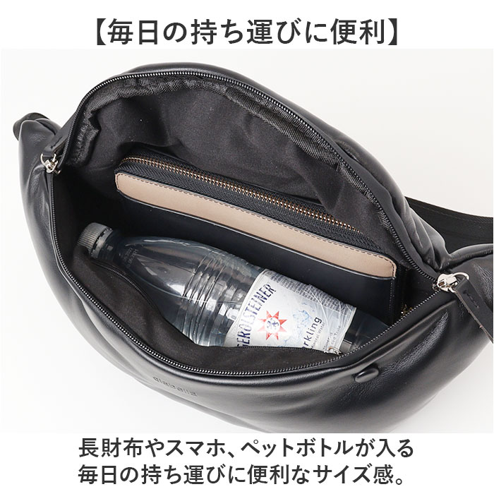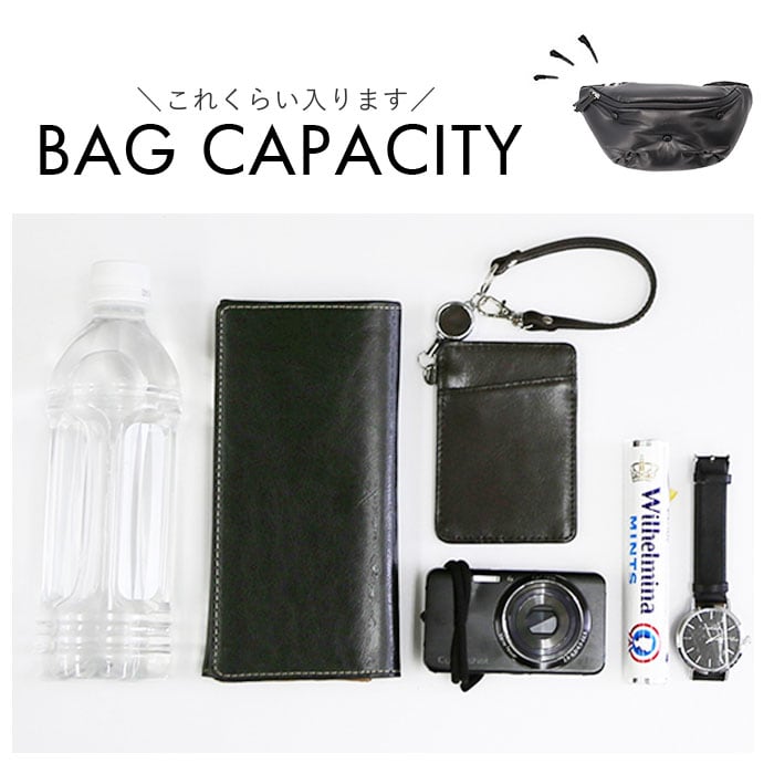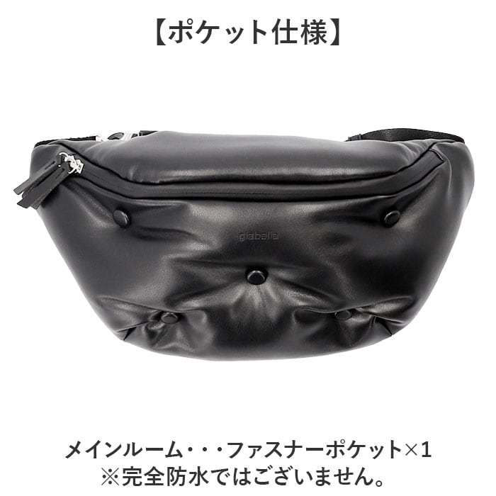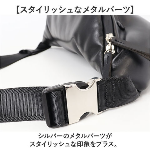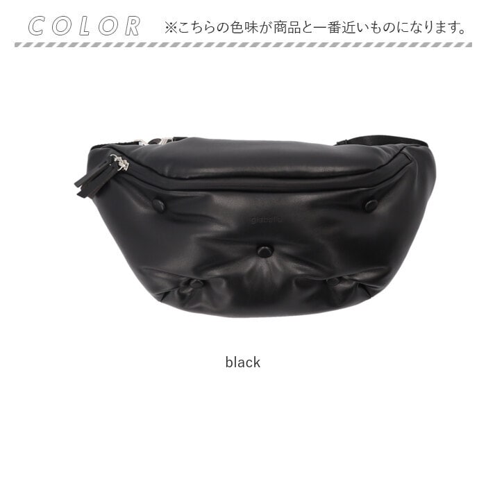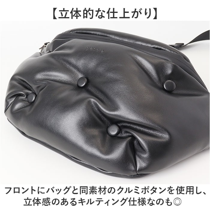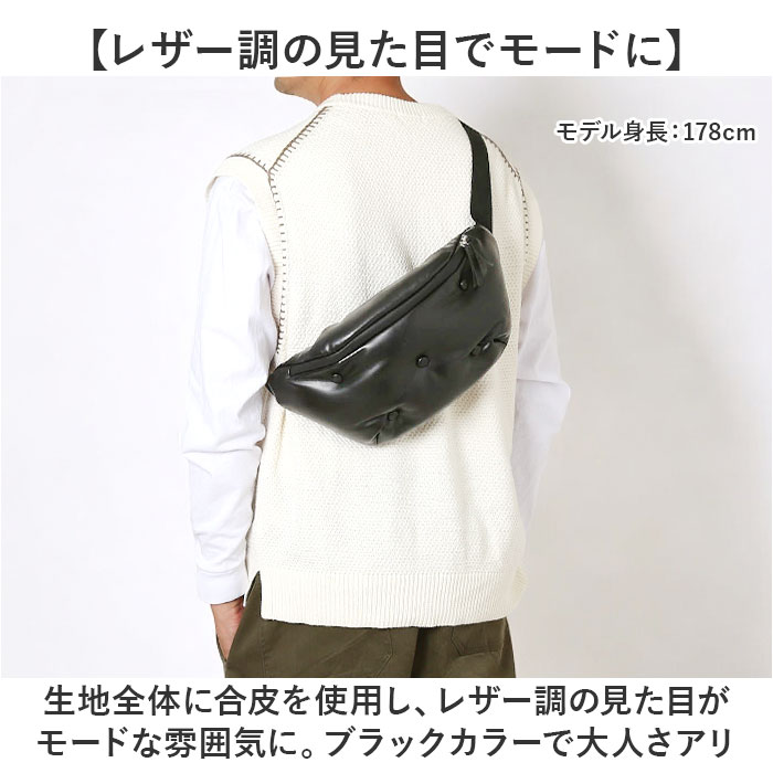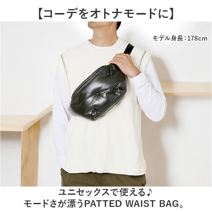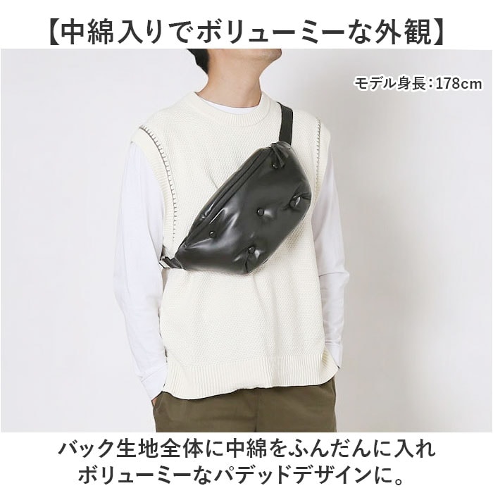 商品説明【コーデをオトナモードに】ユニセックスで使える♪モードさが漂うPATTED WAIST BAG。【レザー調の見た目でモードに】生地全体に合皮を使用し、レザー調の見た目がモードな雰囲気に。ブラックカラーで大人さアリ【中綿入りでボリューミーな外観】バック生地全体に中綿をふんだんに入れボリューミーなパデッドデザインに。【立体的な仕上がり】フロントにバッグと同素材のクルミボタンを使用し、立体感のあるキルティング仕様なのも◎【スタイリッシュなメタルパーツ】シルバーのメタルパーツがスタイリッシュな印象をプラス。【毎日の持ち運びに便利】長財布やスマホ、ペットボトルが入る毎日の持ち運びに便利なサイズ感。【通り雨にも対応】撥水性のある合皮、ファスナーは止水ファスナーを使用し、通り雨にも対応。※【便利な内装ポケット付き】迷子になりがちな小物を分けて収納できるファスナー付きのポケットを内側に配置。【ポケット仕様】メインルーム・・・ファスナーポケット×1【注意点】※ 完全防水ではございません。