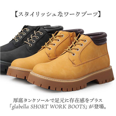 | 商品説明 | 【スタイリッシュなワークブーツ】厚底タンクソールで足元に存在感をプラス「glabella SHORT WORK BOOTS」が登場。【ワークブーツらしい定番のデザイン】履き口の柔らかなクッション、六角のアイホールとトラ紐でワークブーツらしさがさらにアップ。【さりげなくスタイルアップ】約4cmのヒール高タンクソールに、約2cmのインヒールを搭載。自然にスタイルアップが叶う!【安定感のある歩行をサポート】ソール前側には程よい厚み、ヒールは八の字に広がりがあり、凹凸もしっかりあるので安定感◎【脱ぎ履きスムーズ】ブーツの脱ぎ履きの煩わしさを軽減してくれる、片サイドジップ仕様。【イージーケアのPUレザー】マットで独特な色ムラのあるヌバック調の合皮素材。柔らかく、足馴染みの良さもポイント。【ムレにくく快適な履き心地】ライニングやインソールはメッシュ素材。ムレにくくオールシーズン快適。【クッション性があり歩きやすい】インヒールは程よくクッション性があり、足の疲れを軽減してくれる低反発素材を使用。【オン・オフ問わず活躍】スニーカー感覚で気軽に履ける履き心地にこだわった1足。様々なスタイルに幅広く対応。 |