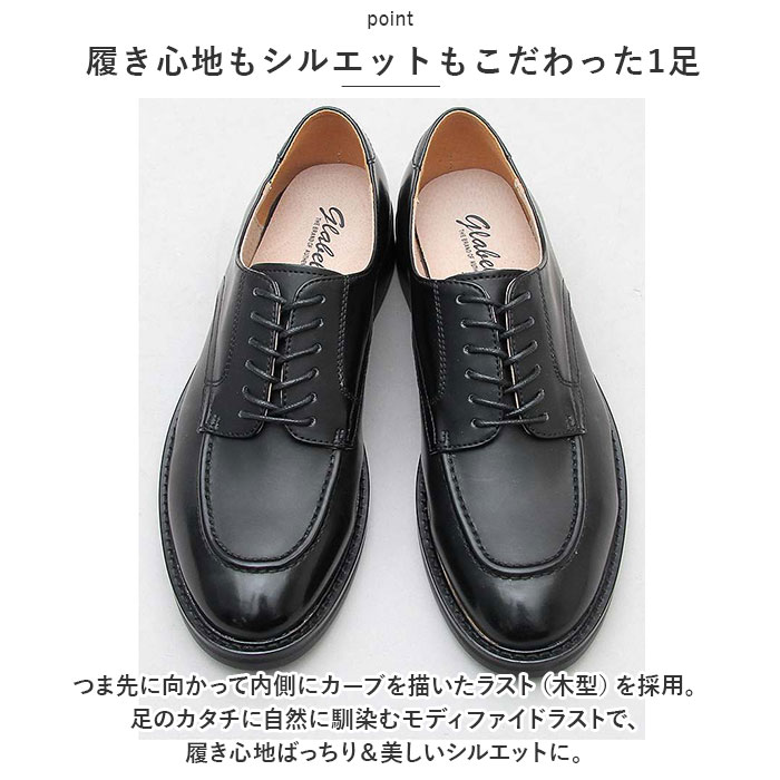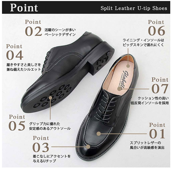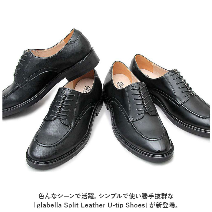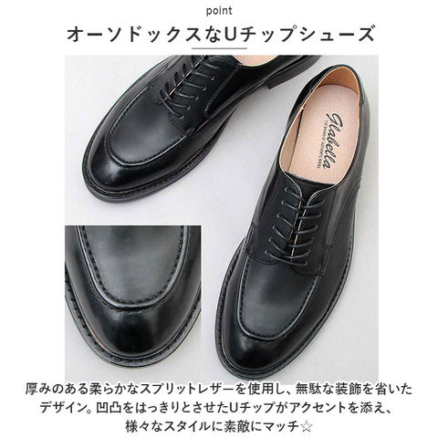 | 商品説明 | 色んなシーンで活躍。シンプルで使い勝手抜群な「glabella Split Leather U-tip Shoes」が新登場。【オーソドックスなUチップシューズ】厚みのある柔らかなスプリットレザーを使用し、無駄な装飾を省いたデザイン。凹凸をはっきりとさせたUチップがアクセントを添え、様々なスタイルに素敵にマッチ☆【フィット感を高めるシューレースタイプ】紐の結び具合で多少のサイズ調節が可能。シューズと足が一体化するような、心地良い着用感。【履き心地もシルエットもこだわった1足】つま先に向かって内側にカーブを描いたラスト(木型)を採用。足のカタチに自然に馴染むモディファイドラストで、履き心地ばっちり&美しいシルエットに。【安定感のあるアウトソール】ヒール部分に丸状の凹凸を施し、グリップ力に優れたアウトソール。厚みを持たせつつEVA素材を挟んで重量を抑え、歩きやすいのもポイント。【ストレスフリーな質感】ライニングやインソールには、ムレにくいピッグスキンを使用。長時間の着用でも足がムレにくく快適。【足裏にかかる負担を軽減】低反発素材とクッション材を組み合わせたインソール。足裏を優しく包み込んで、足の疲れを和らげる!【選べる2タイプ】ややシボ感があり、適度な光沢を持たせたBLACK-A。立体感を出し、セットアップコーデなどにおすすめなBLACK-B。お好みでチョイス!【お手入れもラクラク】本革のしなやかさと、フェイクレザーの撥水性のイイトコドリ!お手入れの手間を取らず扱いやすい、気軽に履ける万能アイテム。 |
